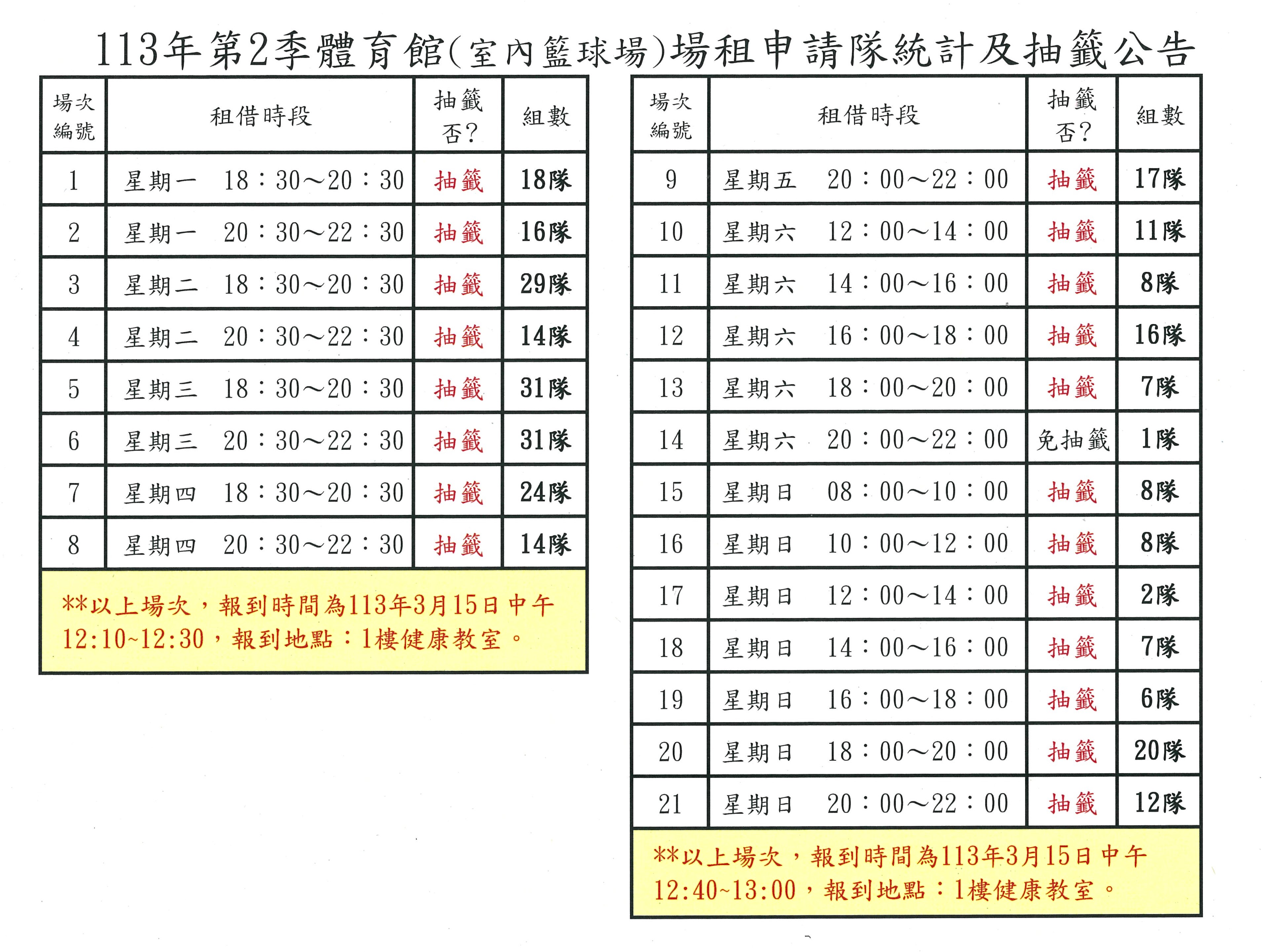 一、經統計本次場租登錄申請,計有20個時段需進行抽籤(如下圖),本校訂於113年3月15日中午12:30於本校1樓圖書館會議室進行抽籤,請以上時段申請人務必親自到場參加抽籤(或授權代理人出席且每人限代理1人),逾時未到者,視同放棄抽籤資格;出席人員需攜帶身份證明文件以供核對資料,授權書範本如附件。