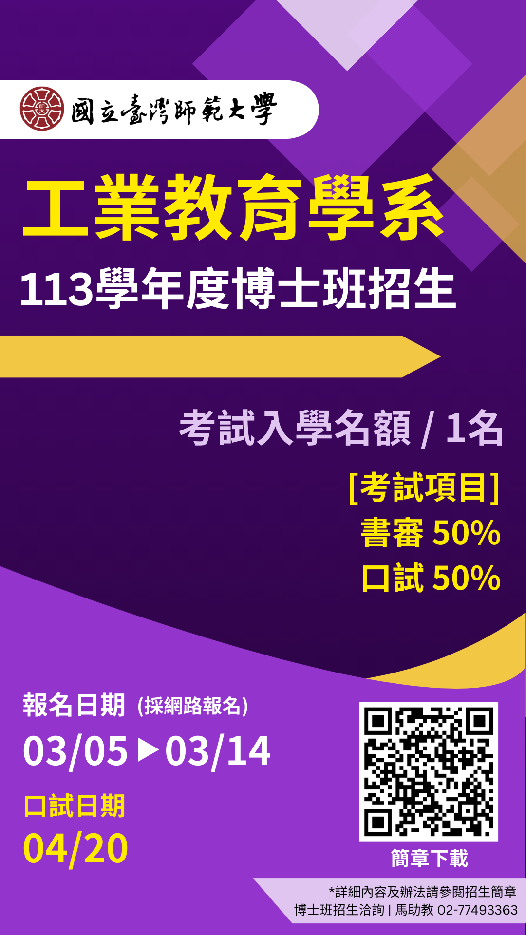 【轉知】國立臺灣師範大學工業教育學系「113學年度博士班考試入學」招生