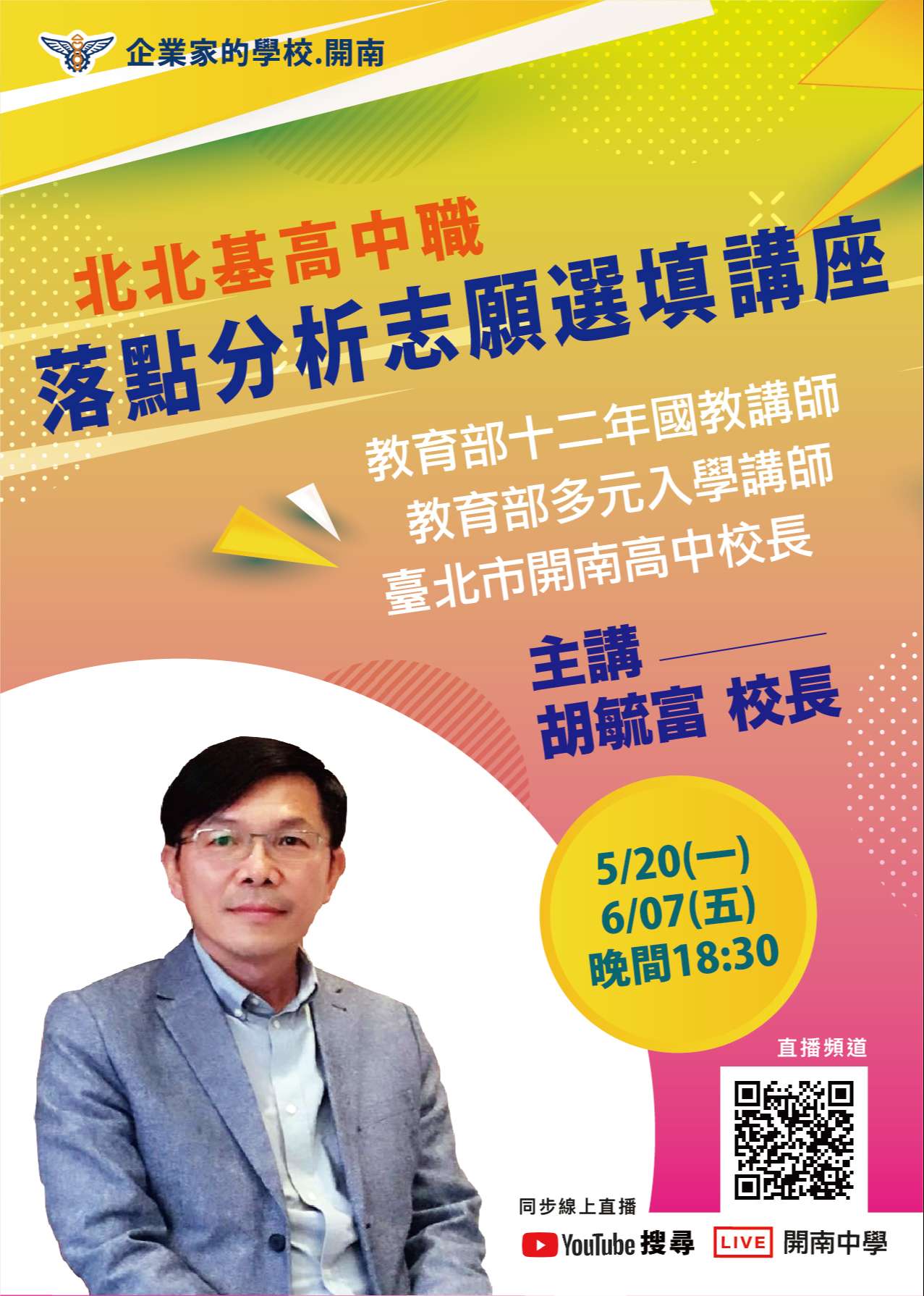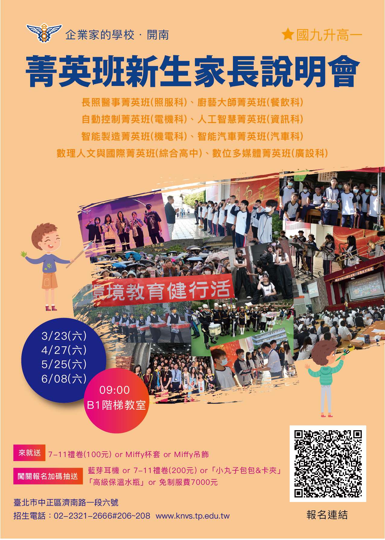 二、本校於113年3月23日、4月27日、5月25日、6月8日(星期 六)上午09:00~11:30辦理「菁英班新生家長說明會」 及5月20日(星期一)、6月7日(星期五)晚上18:30 辦理 「基北區高中職志願選填vs落點分析」線上直播講座,隨 函檢送「說明會海報」、「線上直播講座海報」,特邀請 國九家長暨子弟參加,敬盼 師長能協助公告於貴校 官網,報名網址如下: