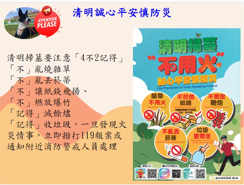 清明節將至,為防範墓地火災,臺北市政府消防局提醒民眾清明掃墓要注意「4不2記得」:「不」亂燒雜草、「不」亂丟菸蒂、「不」讓紙錢飛揚、「不」燃放爆竹、「記得」滅餘燼、「記得」收垃圾,一旦發現火災情事,立即撥打119報案或通知附近消防警戒人員處理。