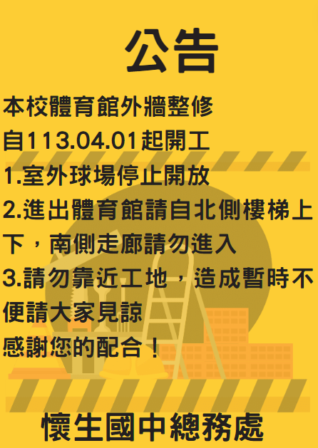 自113.04.01起開工,室外球場即日起停止開放預計至113.06.15 感謝配合