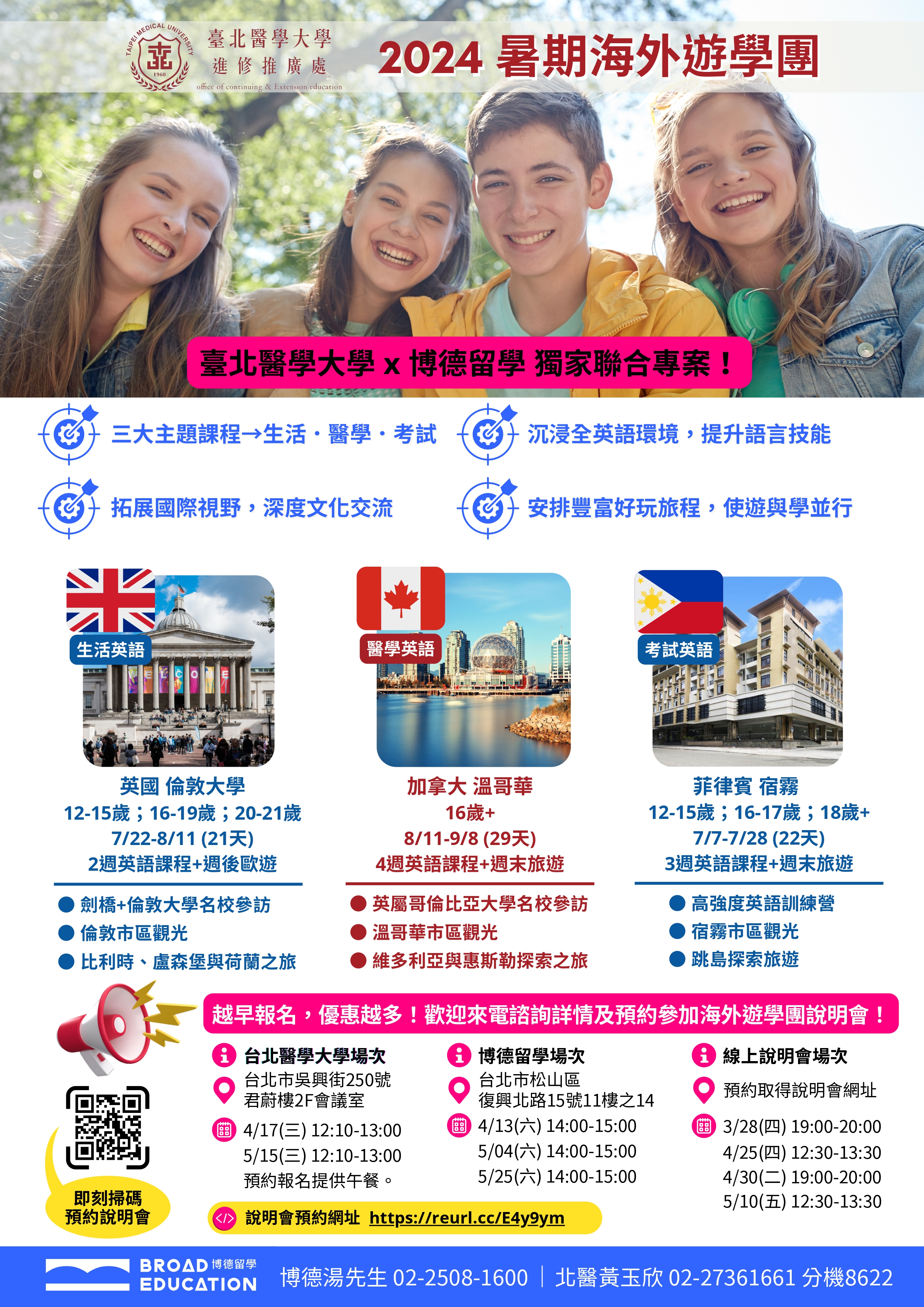 一、台北醫學大學舉辦海外遊學團已邁入第 23 期且不限北醫學生參 加,今年舉辦三團,簡要資訊如下: