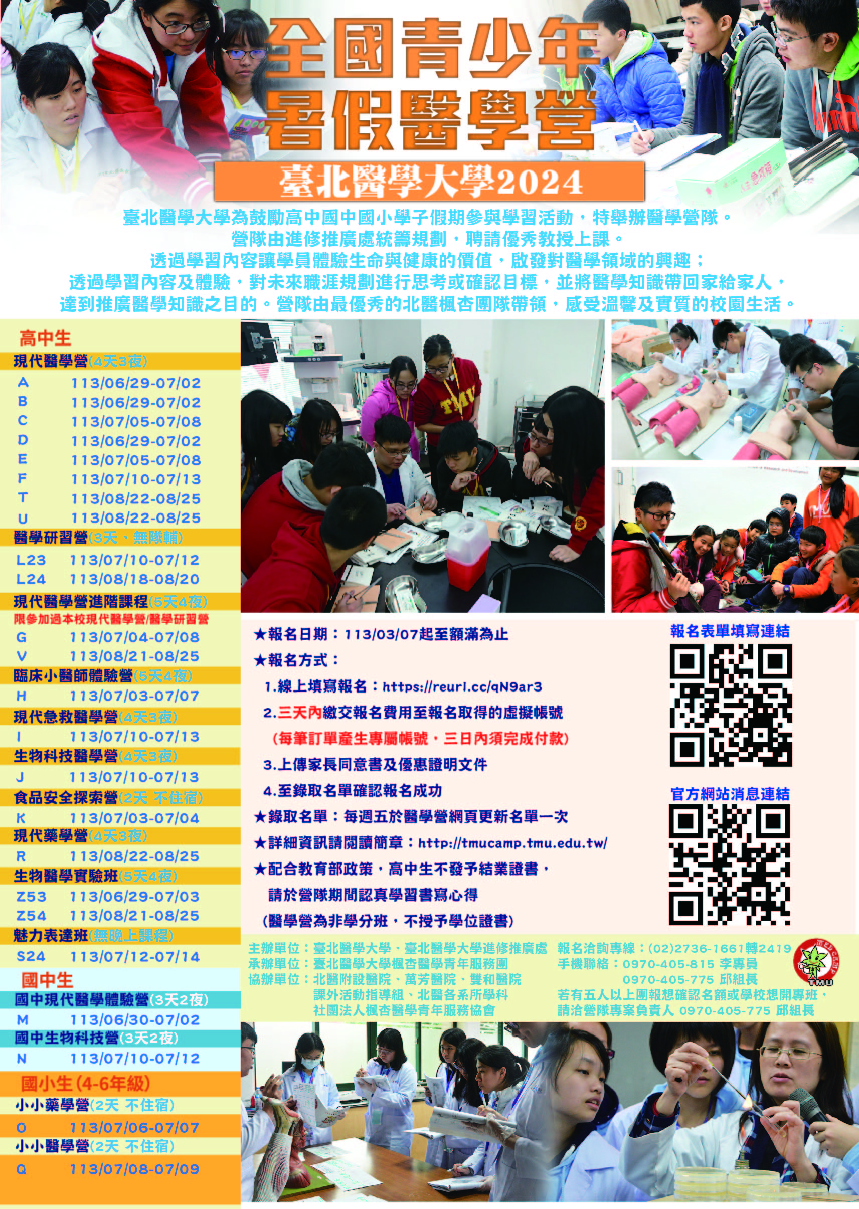 二、營隊資訊:2024暑期醫學營擬訂於民國113年6月29日至8月 25日辦理。網址 http://tmucamp.tmu.edu.tw/