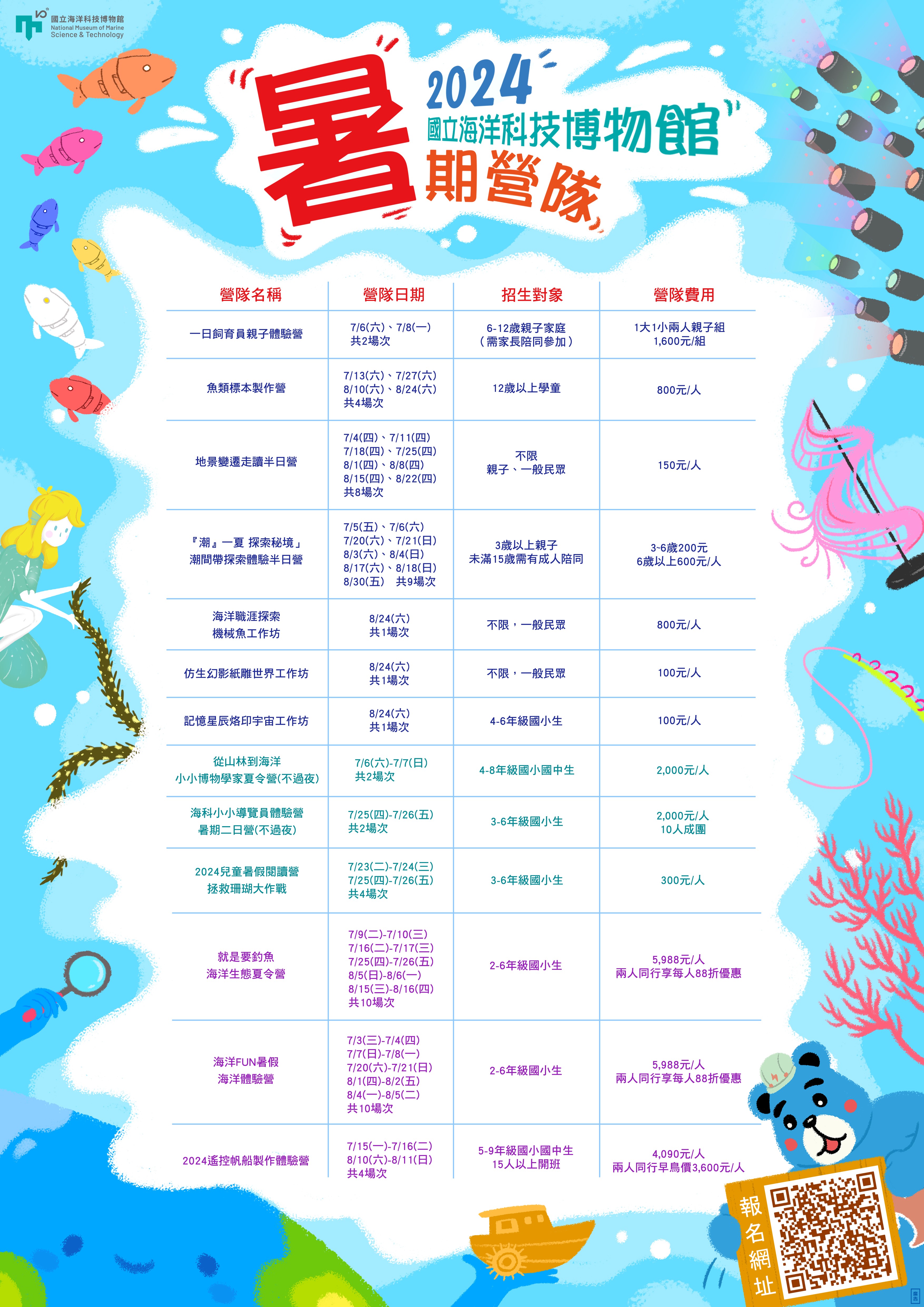 二、課程活動分成一天、兩天的體驗活動及兩天的過夜活動; 有超過40梯次的海科館特色營隊活動讓全民體驗,活動網站:https://www.nmmst.gov.tw/chhtml/newsdetail/556 /8275 內有更詳細的說明。