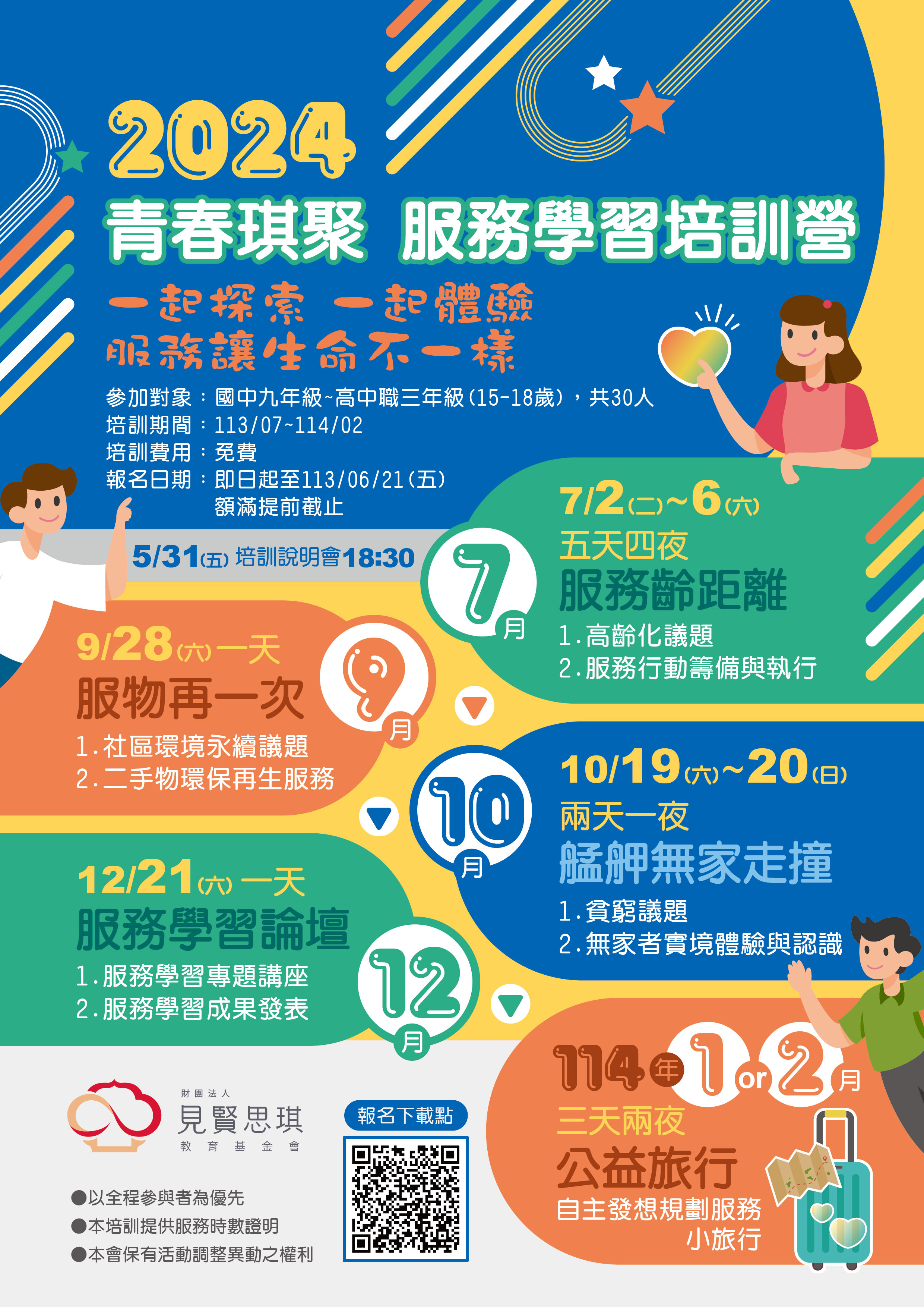 一、財團法人見賢思琪教育基金會規劃辦理『2024青春琪聚-服務學習培訓營』,透過系列性營隊使青少年做中學,並提供社會參與機會,增進青 少年對公共議題的認識,豐富其學習視野,歡迎有服務熱 忱的青少年踴躍參與。