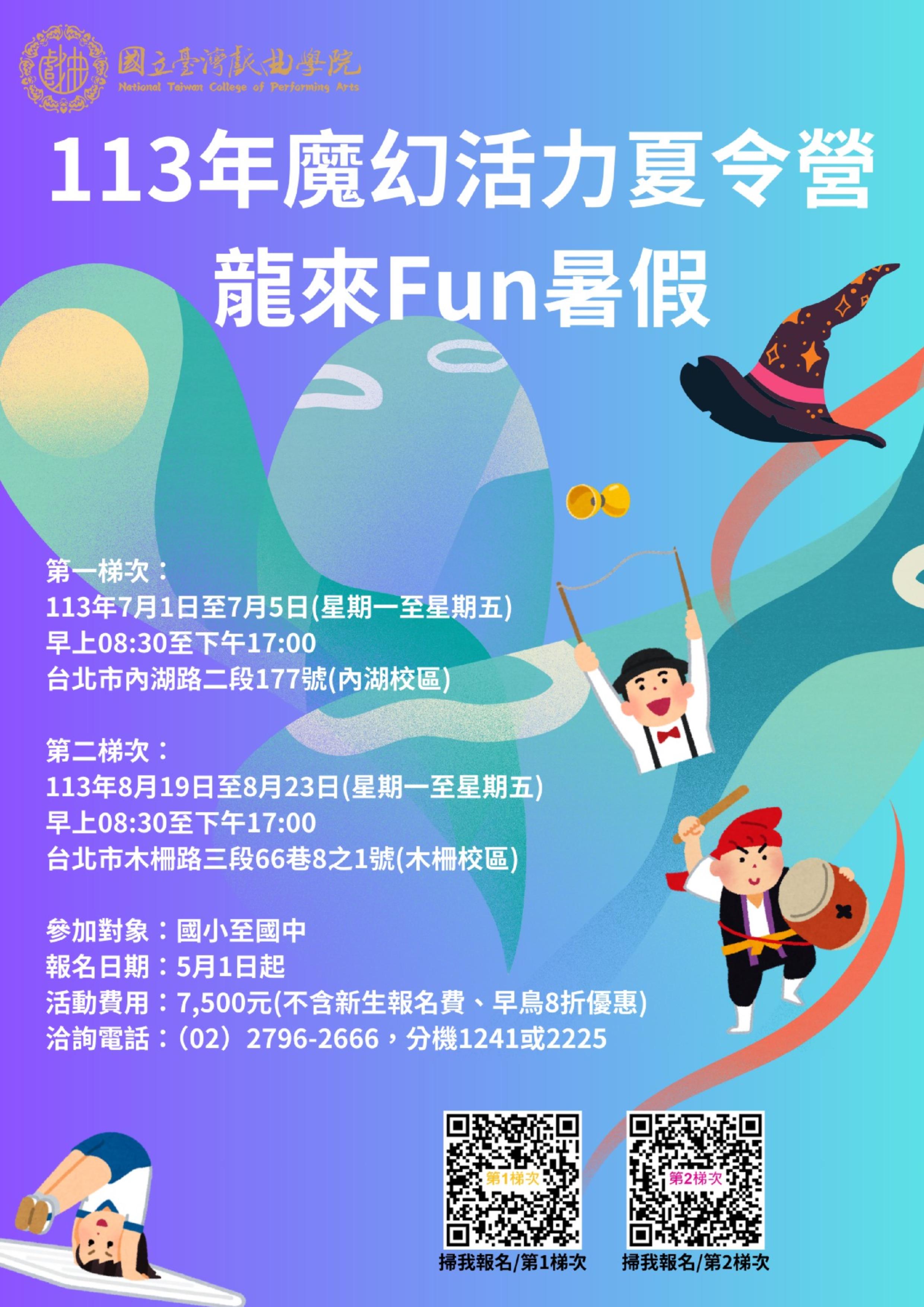 一、旨揭龍來Fun暑假營隊課程包含挑戰極限、鈴轉乾坤、魔幻 威龍及震鼓鳴夏等四大項目,培養學生做中學的專注力及 對傳統表演藝術的審美能力,活動共分兩梯次。