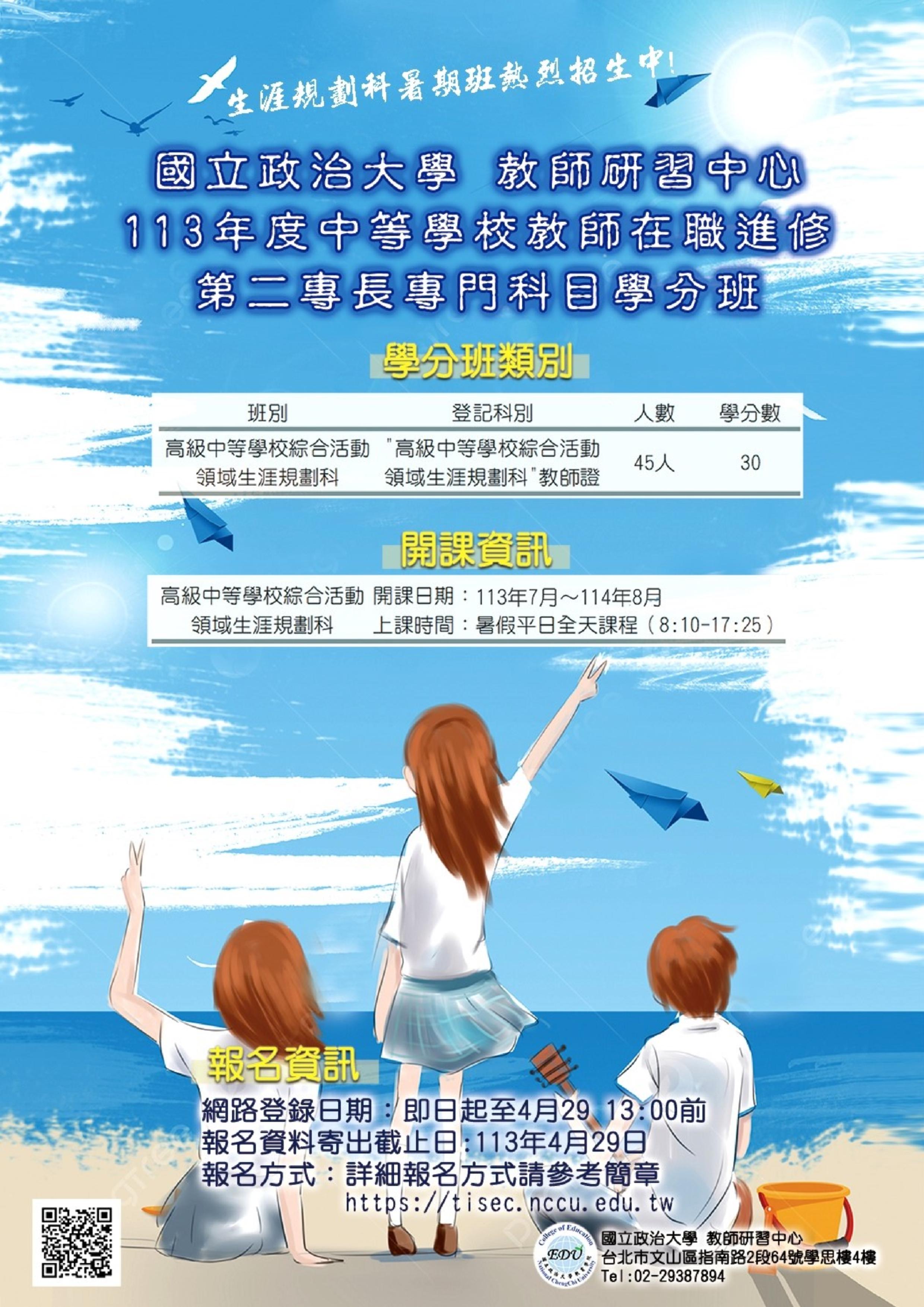 轉知-國立政治大學教育學院教師研習中心辦理「113年度 中等學校教師在職進修第二專長專門科目學分班」正班及 隨班附讀甄審招生