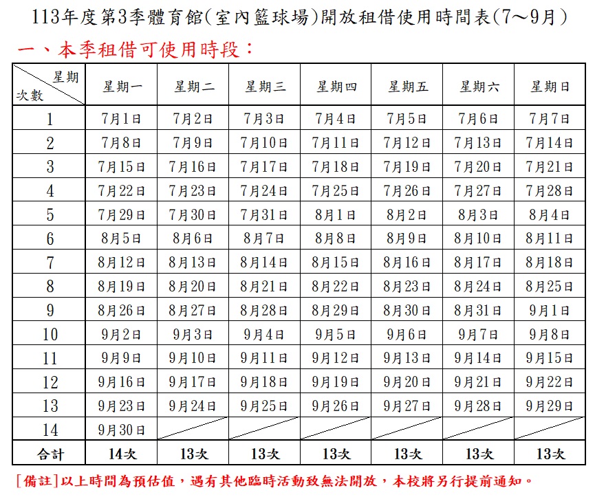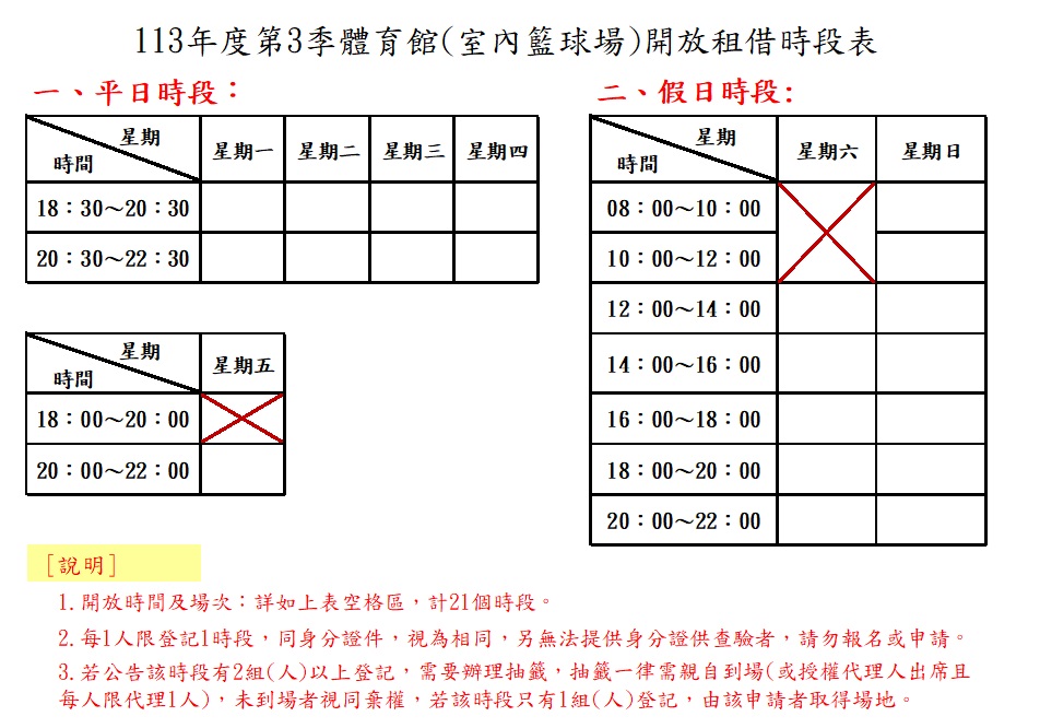 三、113年第3季體育館(室內籃球場)開放租借使用時間及可申請時段資料,如下圖: