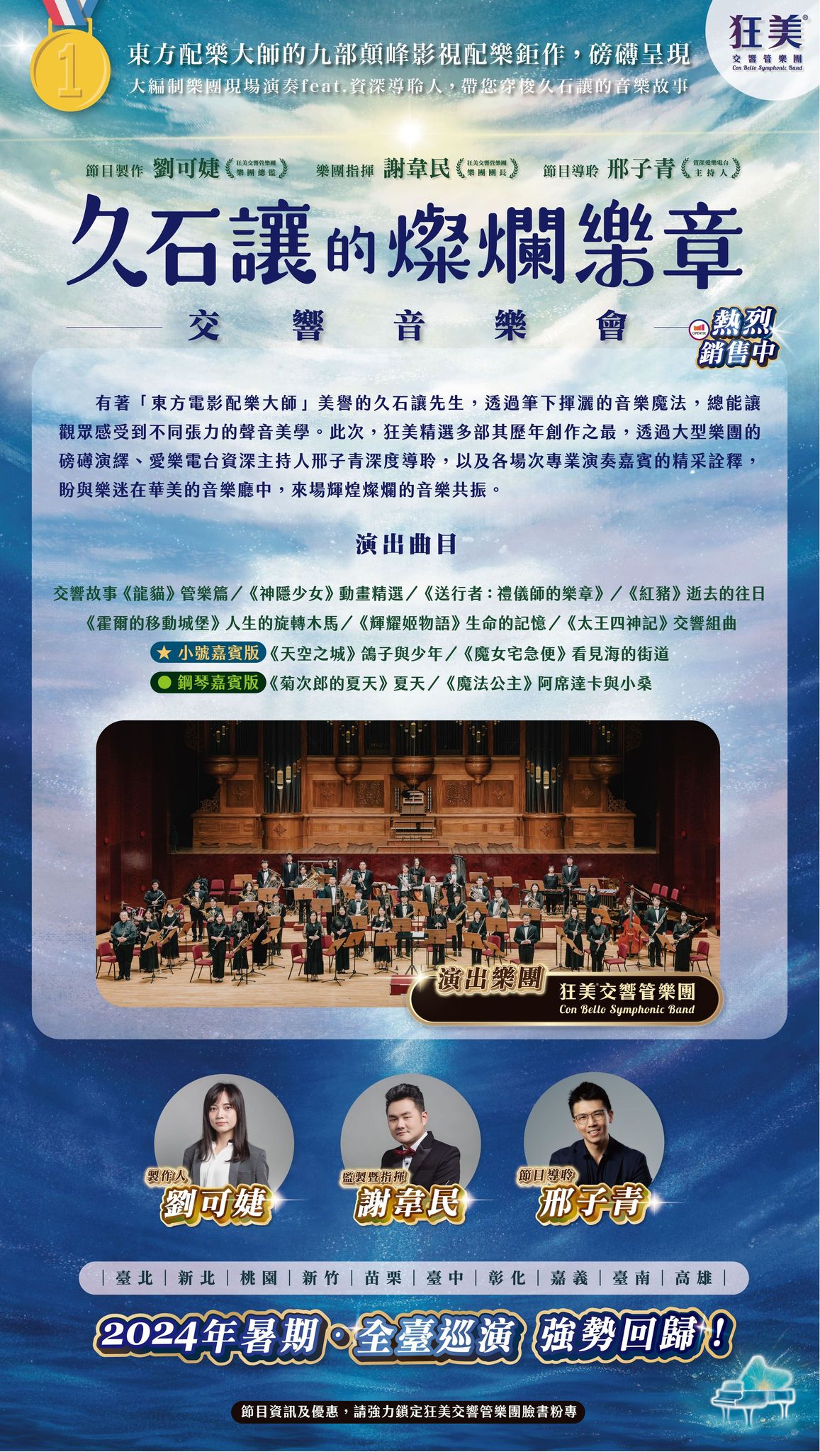 節目介紹:久石讓先生,身兼作曲家、指揮家、鋼琴家, 及「吉卜力工作室」音樂總監的多重身分,透過筆下揮灑 的音樂魔法,他總能在每部影像作品中,讓觀眾感受到不 同張力的聲音美學,本節目中狂美精選多部久石讓先生歷 年創作之最,盼與樂迷朋友在華美的音樂廳中,來場輝煌 燦爛的音樂共振。