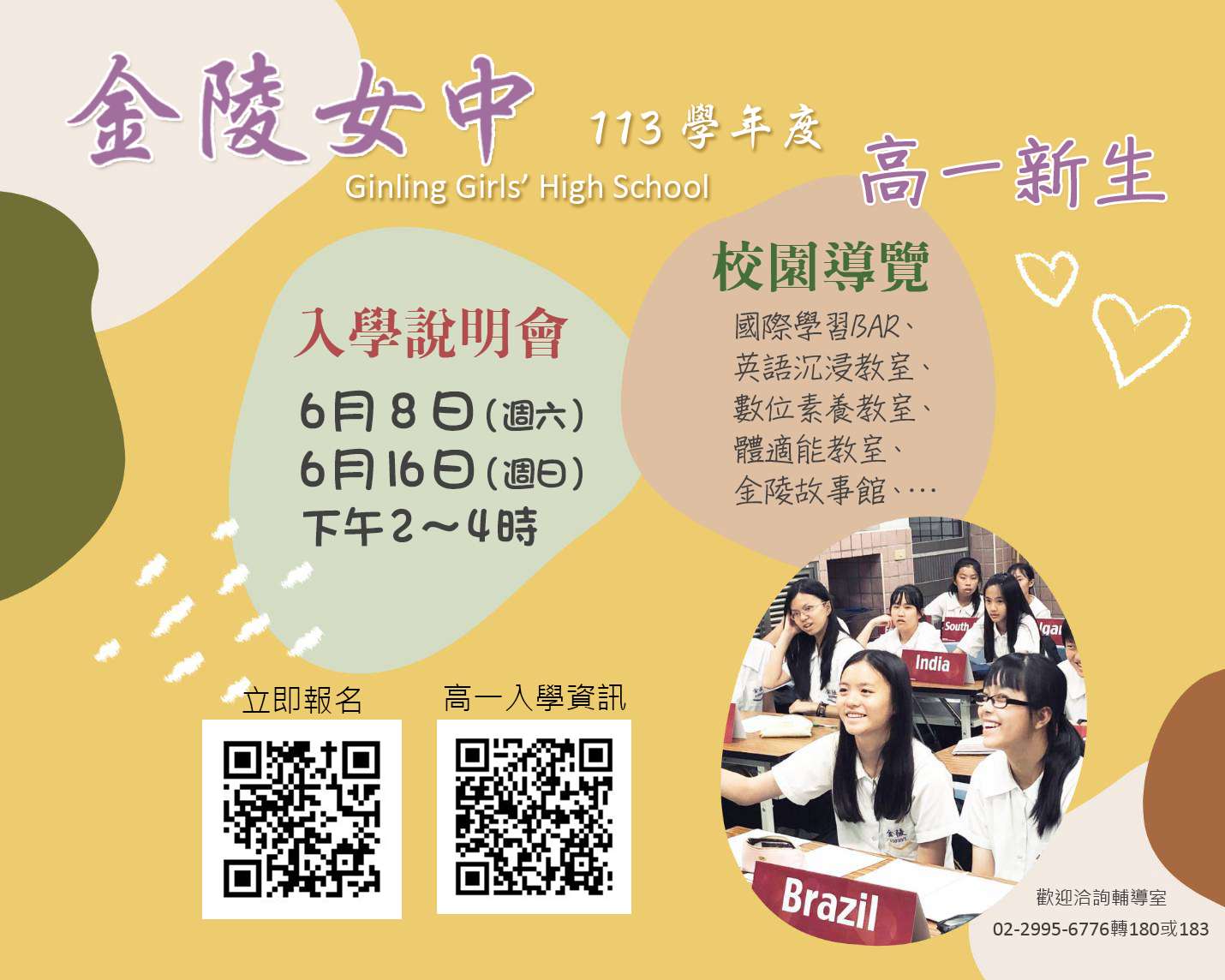 一、本校通過國教署擴增雙語實驗班計畫,設有臺美雙聯學制,並輔導升學美國、英國、澳洲及直升荷蘭阿姆斯特丹大學、英國薩里大學。為提供國三家長及學生,了解金陵 教育理念及特色課程,特辦理校園參訪暨說明會,敬請協助公告並鼓勵踴躍報名。