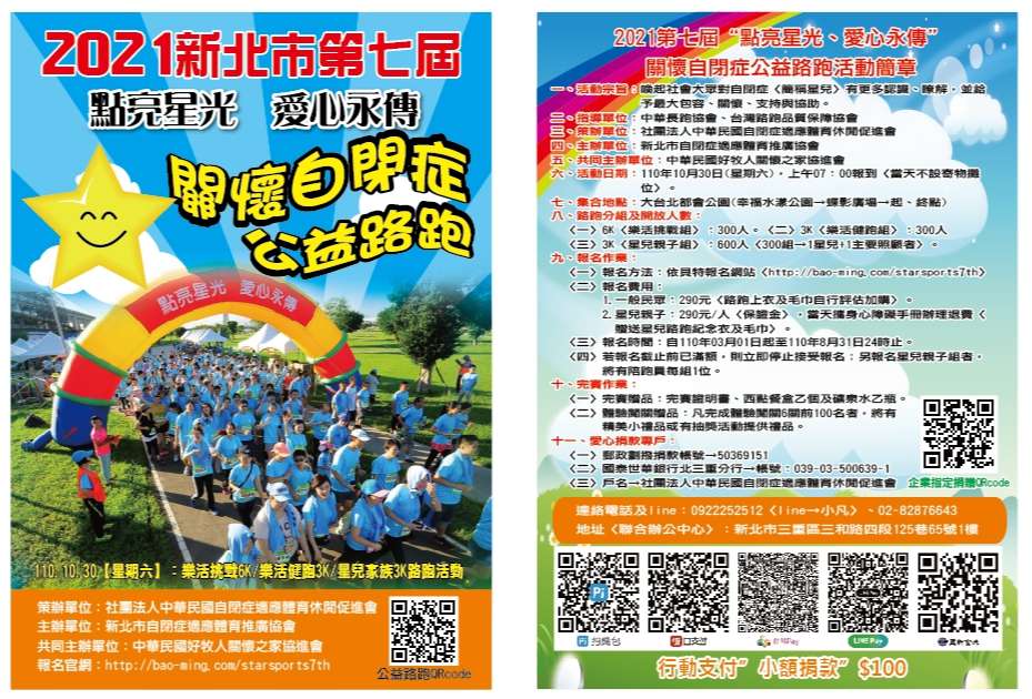 五、由於本次活動主旨乃鼓勵星兒家庭走出戶外,增加社會參與及人際互動機會,凡星兒家族參加者均全額免費〈僅收保證金,現場退還〉,並贈送路跑紀念服、毛巾、餐點、 闖關獎品及抽獎獎品等,此等均賴社會大眾支持,凡有捐贈或贊助者,捐款帳戶如下: (一)銀行名稱:國泰世華銀行北三重分行 (二)戶名:社團法人中華民國自閉症適應體育休閒促進會 (三)帳號:039-03-501020-7