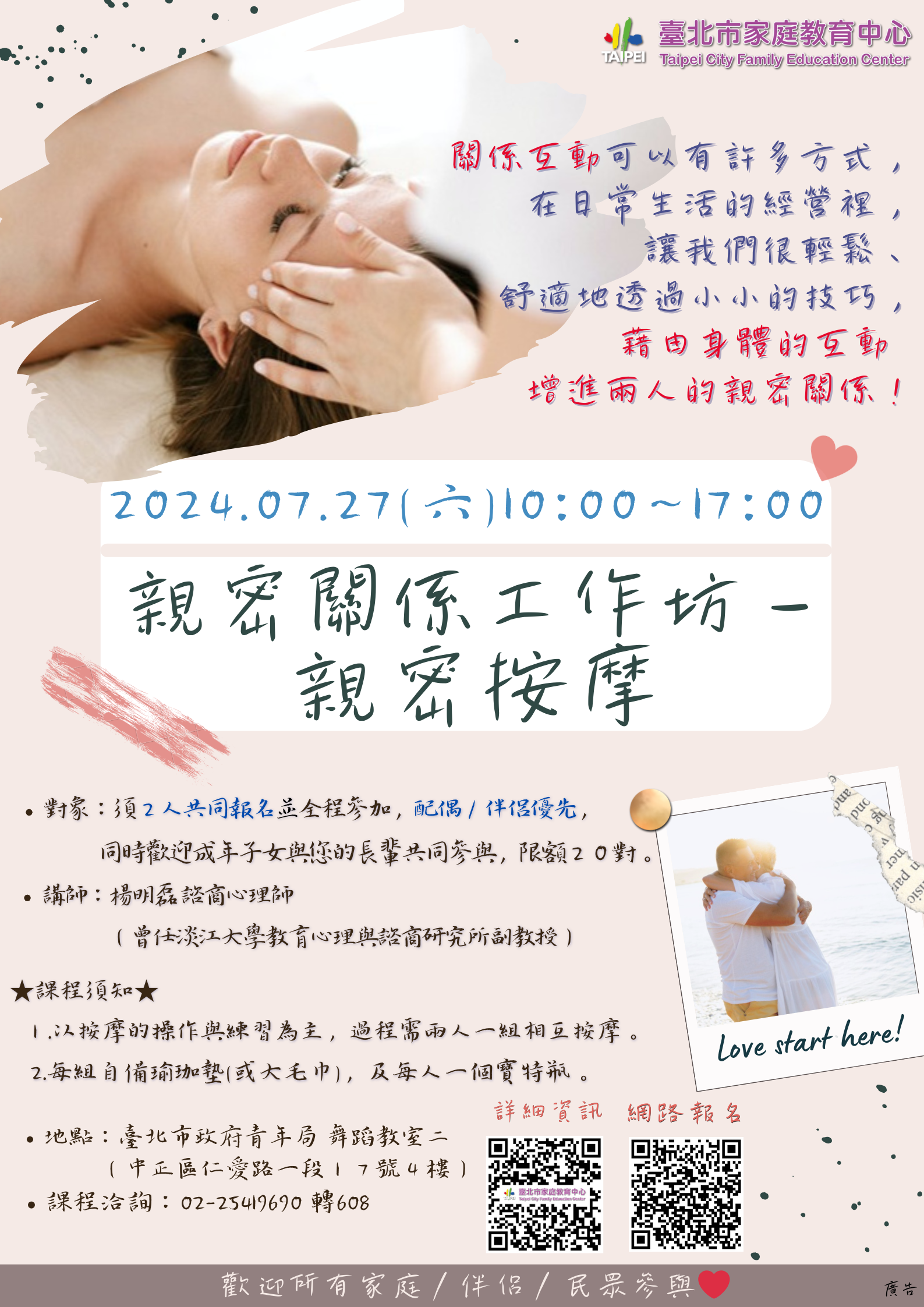 (一)30字:臺北市家庭教育中心「親密關係工作坊-親密按摩」請至官網查詢。