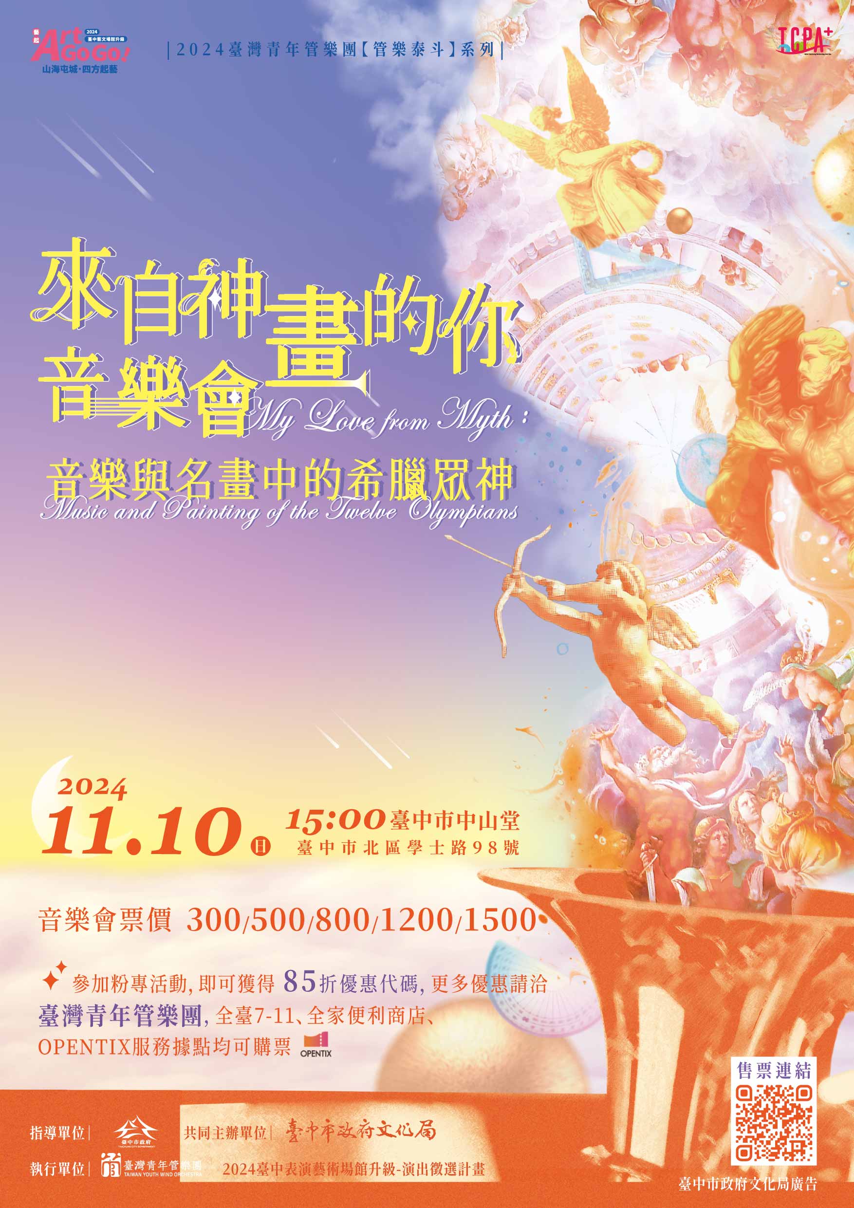 二、節目介紹:臺灣青年管樂團『管樂泰斗』系列音樂會, 2024隆重呈現【來自神畫的你】音樂會-音樂與名畫中的希 臘眾神,是一場融合希臘神話與西班牙作曲家奧斯卡·納瓦 羅的《奧林帕斯諸神》交響組曲的音樂會。十個樂章生動 描繪十二位神祗,以具挑戰性的曲目展現管樂團的卓越演 奏技巧;特邀Podcaster葵花子在樂章中介紹名畫,讓觀眾 更深入理解神話故事。 音樂會還包含2024委託創作《甘露水音畫-永恆的剎那》交響管樂曲,致敬雕塑作品「甘露水」,誠摯邀請貴校全體師生加入 這場神話與藝術的音樂旅程,一同見證奇妙的永恆剎那。 三、OPENTIX售票系統線上購票,訂票流程說明請詳見附檔。 購票連結:https://www.opentix.life/event /1810665502842470400