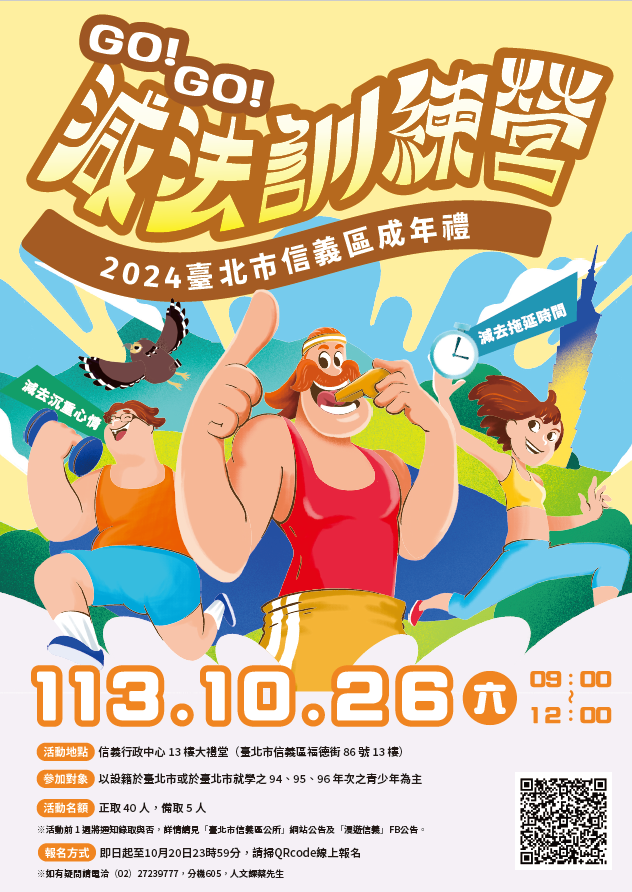 一、「臺北市信義區公所113年度 成年禮活動,訂於113年10月26日(星期六)上午9時舉 辦,活動為實境解謎遊戲,凡成功報名並全程參與之禮 生,可獲得成年禮紀念禮品,並有機會獲得精美獎品及禮 券。即日起開放報名,內容豐富精彩,歡迎設籍或就讀於 臺北市學校之青年男女(民國94至96年次)踴躍報名參 加。」