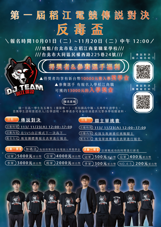 二、活動一、傳說對決 (一)比賽時間:傳說對決訂於113年11月23日13:00至17:00 (二)報名時間:即日起至113年11月20日中午12:00 (三)報名資格:國一至高一學生,休學者亦符合資格但須提 供相關資料。 (四)地點:台北市私立稻江商業職業學校(台北市大同區民權 西路225巷24號) (五)賽事獎金:冠軍獎金5000元、亞軍獎金4000元、季軍獎 金3000元、殿軍獎金、2000元