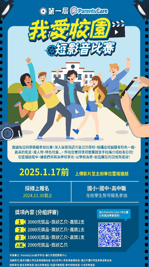 一、比賽報名網址https://www.beclass.com /rid=2748c55634801c34e9dd,活動詳情可至ParentsCare 家長大小事FB粉絲專頁(https://www.facebook.com /groups/434955752481737/)查詢。