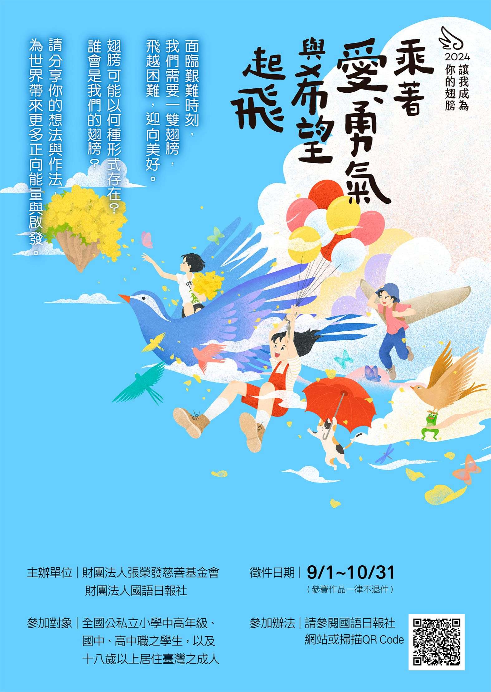 一、為了鼓勵正面助人的精神,強調社會連結與人際支持的重要,本社與張榮發慈善基金會合辦「2024讓我成為你的翅膀──乘著愛、勇氣與希望起飛」徵件活動。