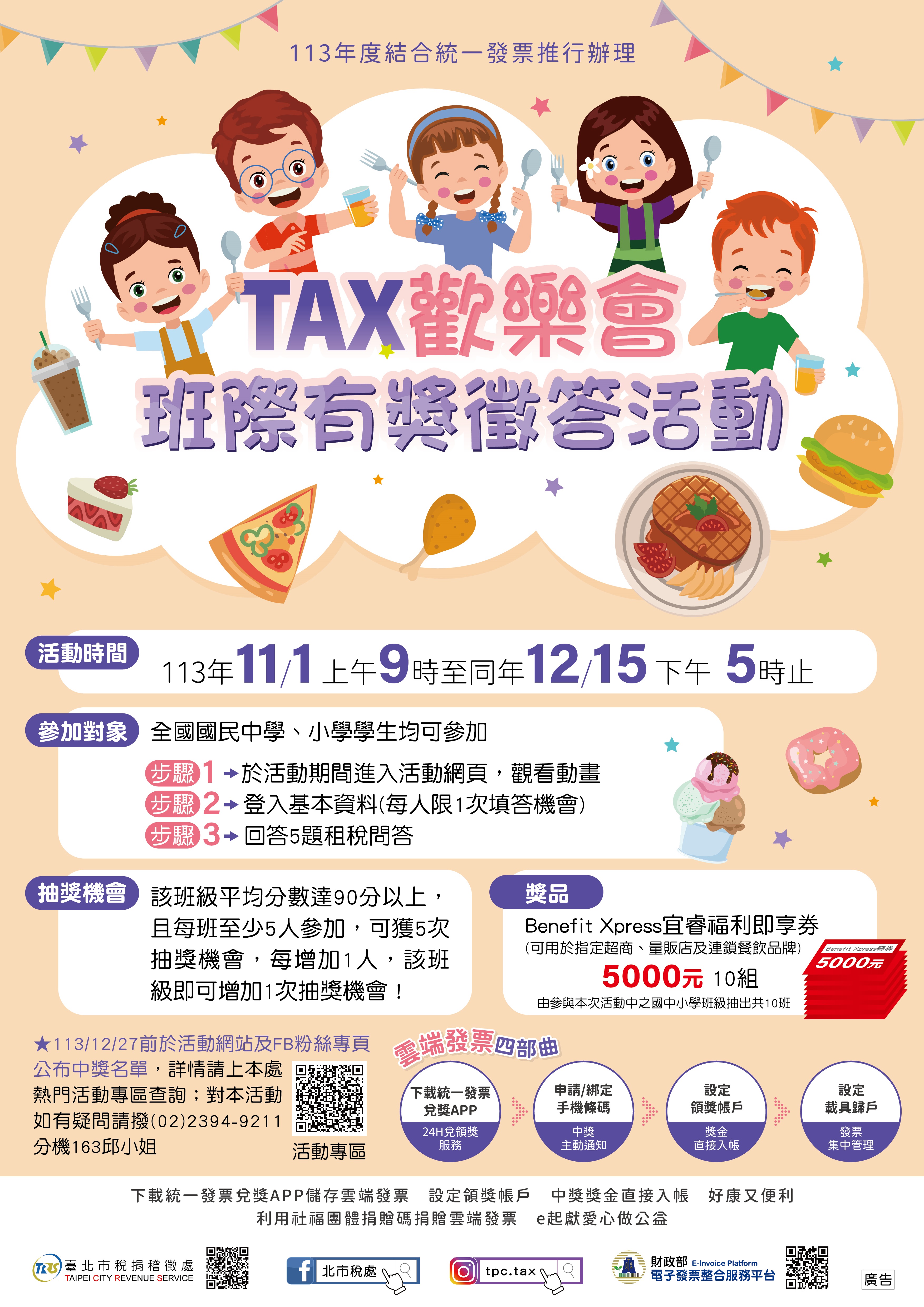 北市稅處-TAX歡樂會 班際有獎徵答抽獎活動開跑啦!自即日起至12月15日17時止,全國國中國小學生只要至活動頁面觀看動畫,並回答5題問題,每班級至少5人參加且平均分數達90分以上即可參加抽獎!