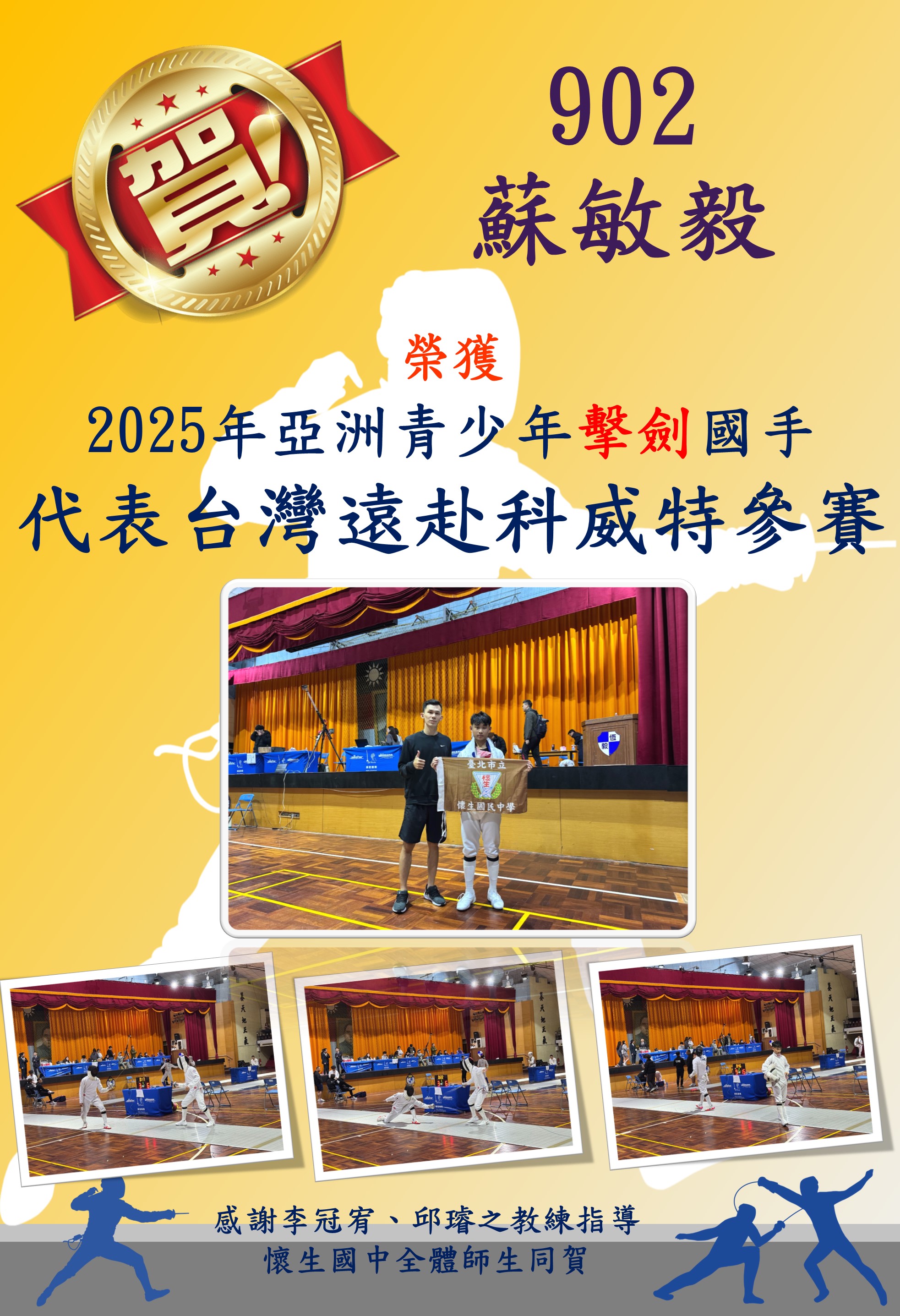 賀! 本校九年級 蘇敏毅 當選2025年亞洲青少年國手,將代表台灣遠赴科威特參賽。
