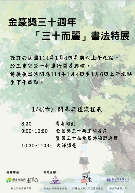 四、金篆獎三十而麗開幕式暨第三十屆金篆獎頒獎典禮將於114 年1月4日(星期六)上午九點於三重空軍一村新北市眷村文 化園區時藝劇場舉辦。