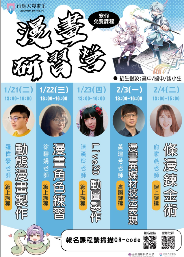 一、活動介紹:本校漫畫系於2025年寒假期間舉辦「漫畫研習 營」免費課程活動,誠摯邀請貴校學生報名參加。本次活 動由專業師資團隊精心設計課程,內容豐富多元,旨在培 養學生對漫畫藝術的興趣與創作能力。