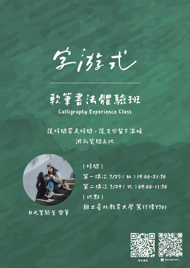 二、報名方式:請至國立臺北教育大學推廣教育中心網頁報名 並繳費。課程相關報名網址如下:《字游式》軟筆書法體 驗班(週四夜晚療癒場) https://cce.ntue.edu.tw/course /5612、《字游式》軟筆書法體驗班(週末晨光場) https://cce.ntue.edu.tw/course/5614。