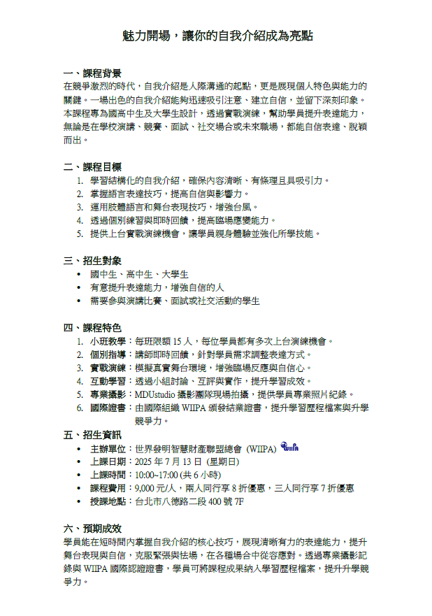 說明: 「魅力開場—讓你的自我介紹成為亮點」課程,專為國中 生、高中生及大學生設計,透過結構化自我介紹訓練、語 言表達與舞台表現技巧,提升學員的溝通能力與自信,助 力未來的升學、競賽與職場發展。