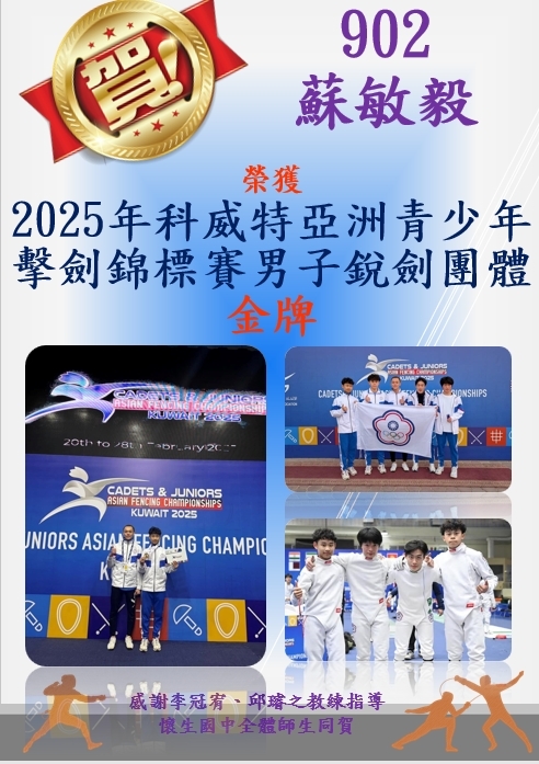 902蘇敏毅榮獲2025年科威特亞洲青少年擊劍錦標賽男子銳劍團體金牌