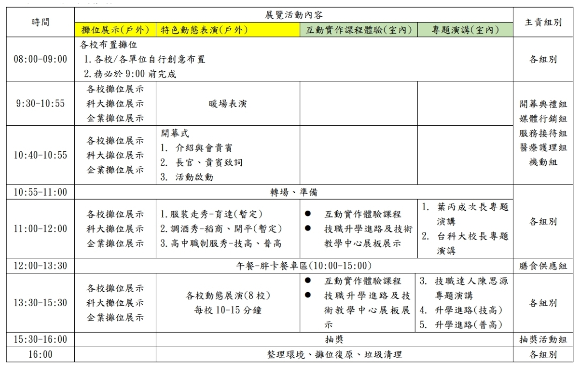 (三)活動形式:由本市69所高中職學校、臺北市技術教學中心、臺北市無人機教育中心、科技大學、企業及臺北市各學層家長會聯合會擺設攤位、辦理講座及體驗。