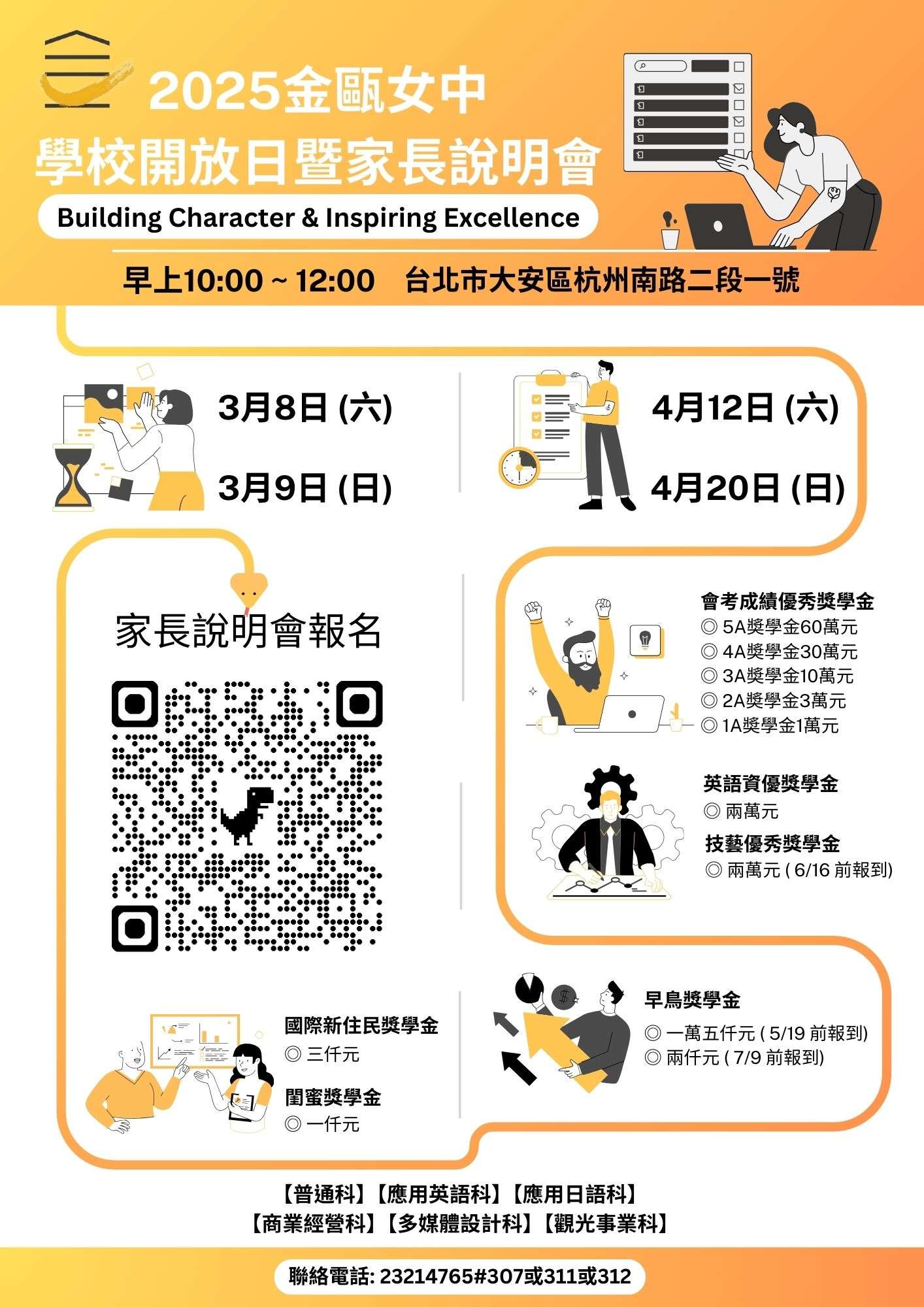 二、報名方式:即日起至114年4月12日(星期六)止,請逕至金 甌女中首頁(網址:https://www.cogsh.tp.edu.tw/home) 掃QR Code、或直接至Google表單(網址:https://https: //forms.gle/DHQJaG4gHAYqZwm78)報名參加。