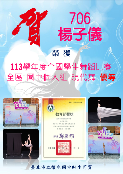本校 706 楊子儀參加113學年度全國學生舞蹈比賽 榮獲 全區 國中個人組 現代舞 優等。