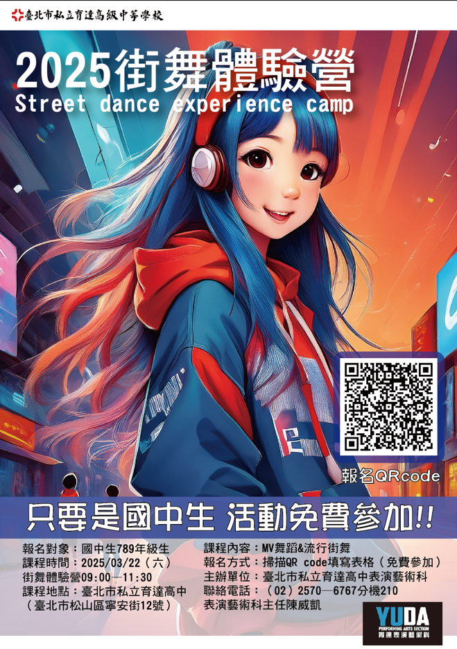 一、育達高中以掌握趨勢,培育達人作為宗旨。陶冶專業表演 藝術(舞蹈、劇劇、綜藝)人才,舉辦畢業公演、組展、班 展及活動競賽,提升學生表演實力,配合展演實務課程, 奠定其發展之基礎,並透過產學合作,掌握業界與流行的 脈動,增進學生的專業技能與涵養。本次活動特邀本科汪 寧柔老師教授流行街舞課,讓有興趣的國中生,更夠體驗 表藝科的課程與學習訓練,開發及訓練身體,並探索未來 志向。