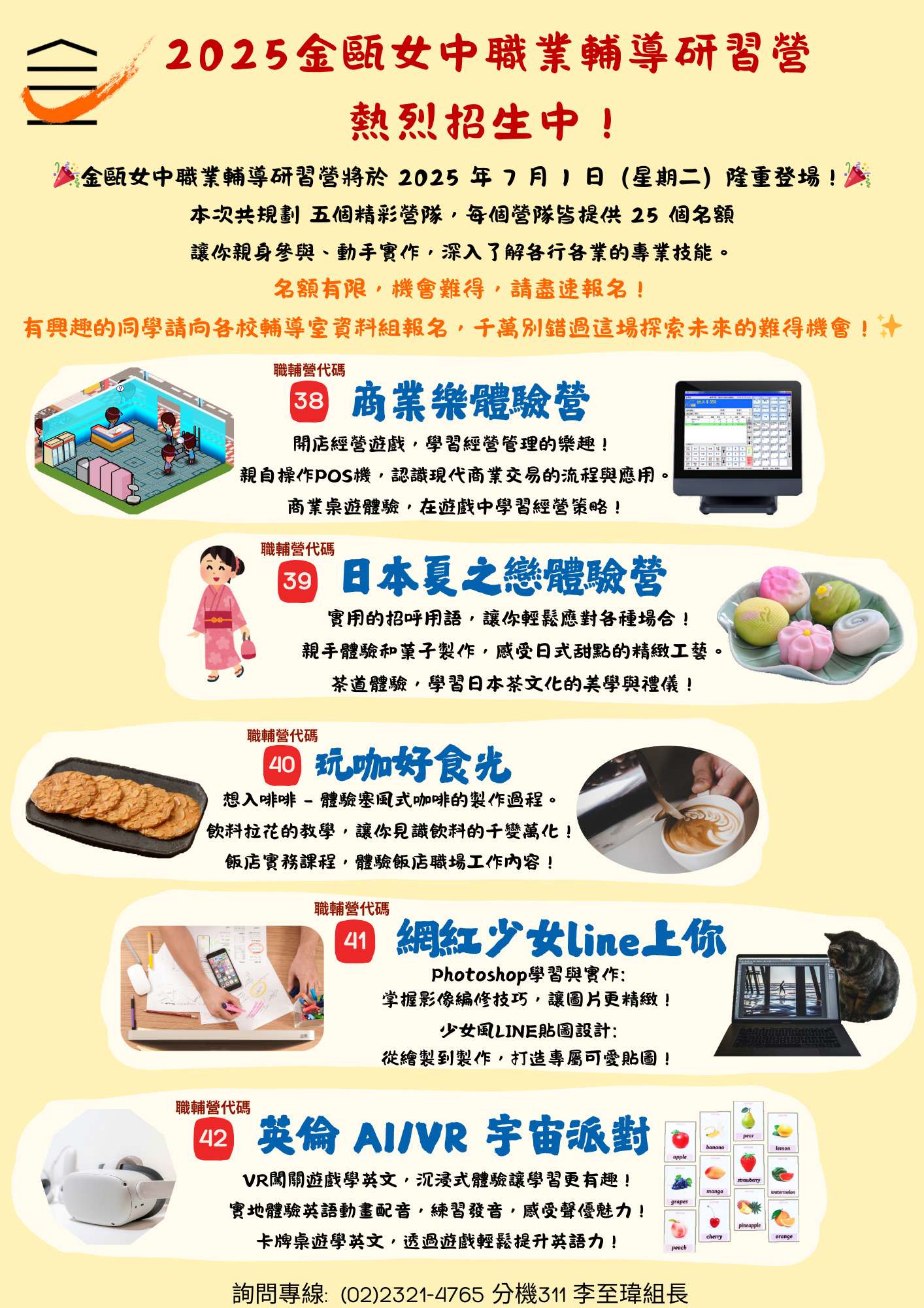 一、本校定於民國114年7月1日(二)於本校辦理【台北市國中生職業輔導研習營】活動,歡迎貴校同學報名參加。