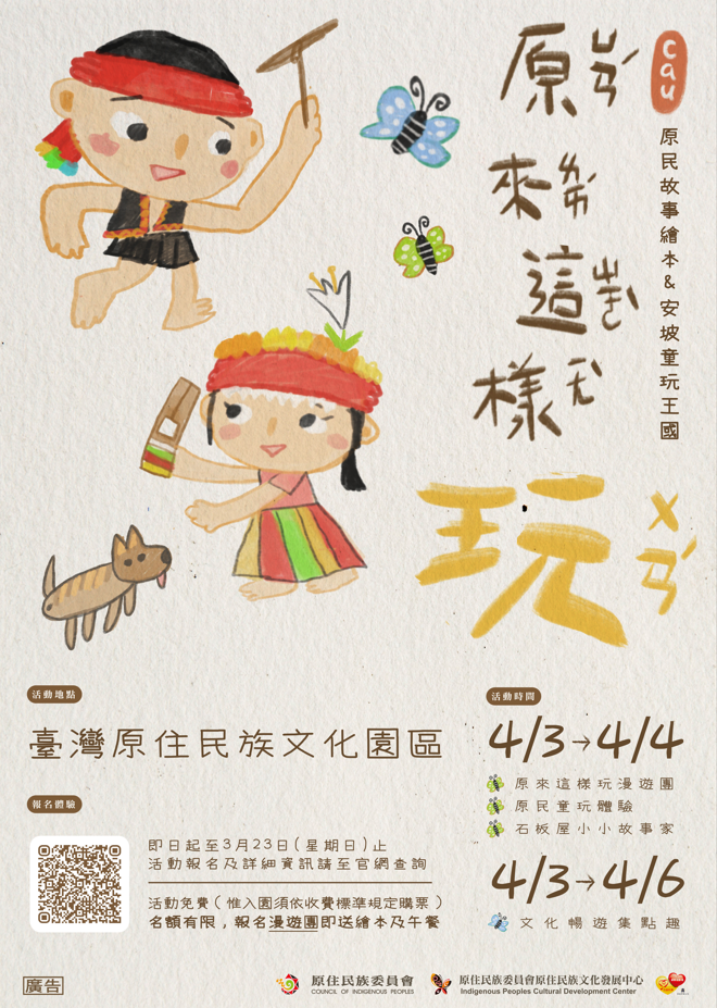 1、由園區達人親自帶領漫遊園區,體驗與手作原民童 玩、導讀原民繪本,並親手製作個人專屬故事書,參 加即送原民故事繪本!活動包含午餐及保險,詳細行 程與介紹請參閱報名表單。
