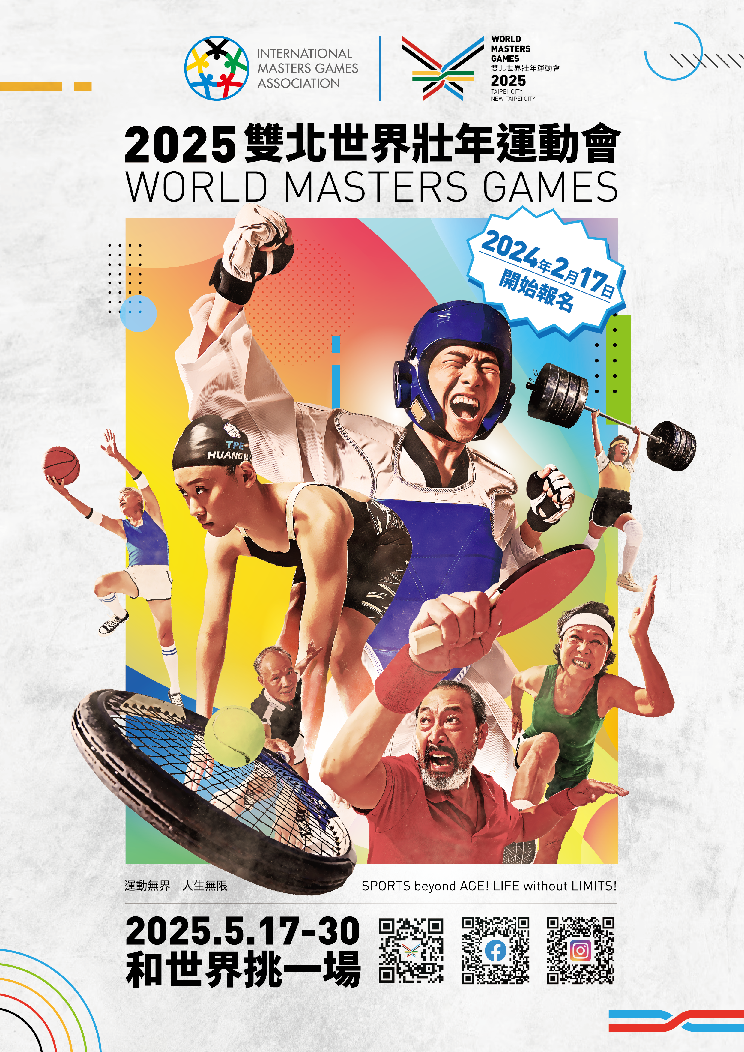 2025雙北世界壯年運動會在臺北,亞洲第一次,臺灣第一次,5/17—5/30,讓我們一起為選手加油,見證每一場精彩比賽,一同感受競技的熱血與感動,一起和世界挑一場!