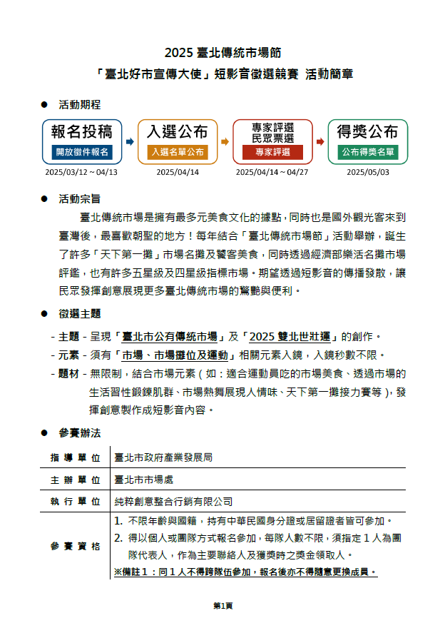 (一)徵件主題:呈現「臺北市傳統公有市場」及「2025雙北 世壯運」的創作。