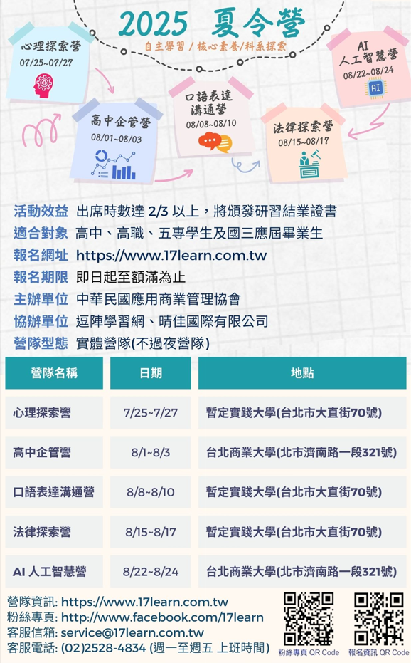 二、營隊名稱:「心理探索營」、「高中企管營」、「口語表達 溝通營」、「法律探索營」、「AI人工智慧營」。