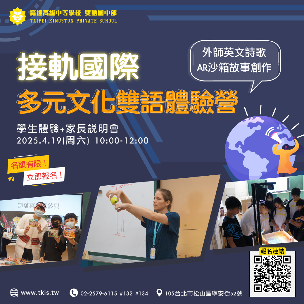 一、課程介紹:全球化的時代,雙語能力是孩子未來發展的重要資產,本次Kingston雙語體驗營集結本校外師與中師,設計一系列豐富有趣的體驗課程,讓學生能在半日的課程中 學習透過AR沙箱進行故事創作並了解原住民的遷移歷史;外師透過英文詩歌,讓學生能接觸英語世界的文化、歷史與情感表達,使學習更具趣味性與文化深度!我們也在同一時間安排114學年入學說明會,深入介紹我們的課程規劃與環境導覽,歡迎爸爸媽媽帶著您的孩子一同報名參加!
