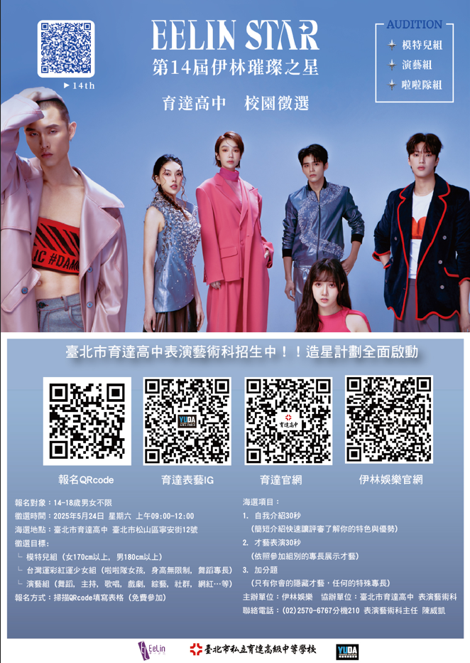 十、活動聯絡人:育達高中表演藝術科主任 陳威凱,電話: (02)2570-6767分機210,Email:yd4008@mail1.yudah. tp.edu.tw