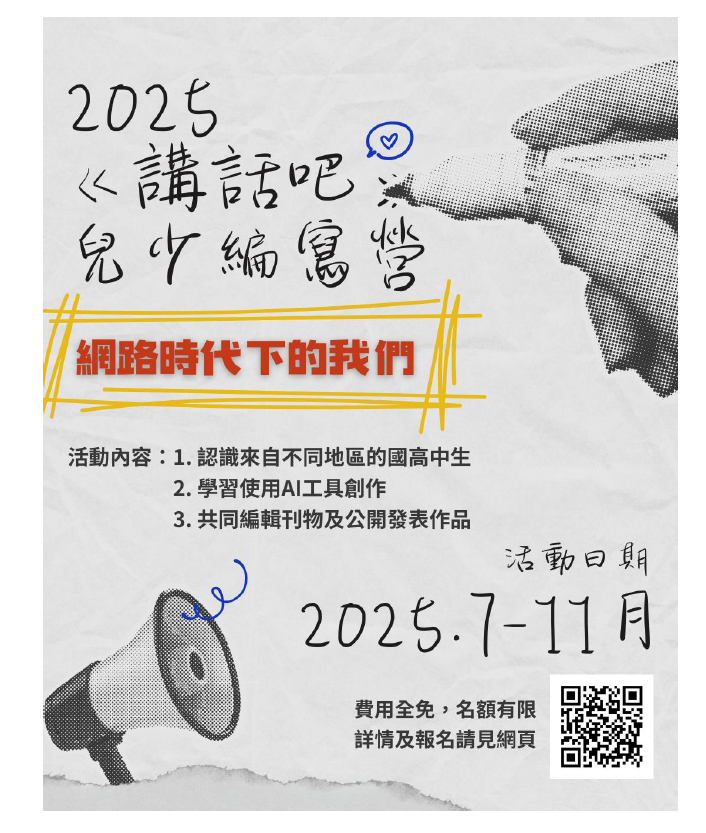 二、本會希望透過編寫營的活動,邀請全國暑假後升國二至高 三的兒少,透過文字的方式,表達自己對生活的觀察和感 受。而參與培力的兒少之作品,將有機會刊登在本會和兒 少共同編輯的刊物中,讓更多大人了解到兒少的世界和聲 音。活動日期擬於2025年7月至11月辦理,全活動包含實體 及線上部份,參加者無須繳納費用。