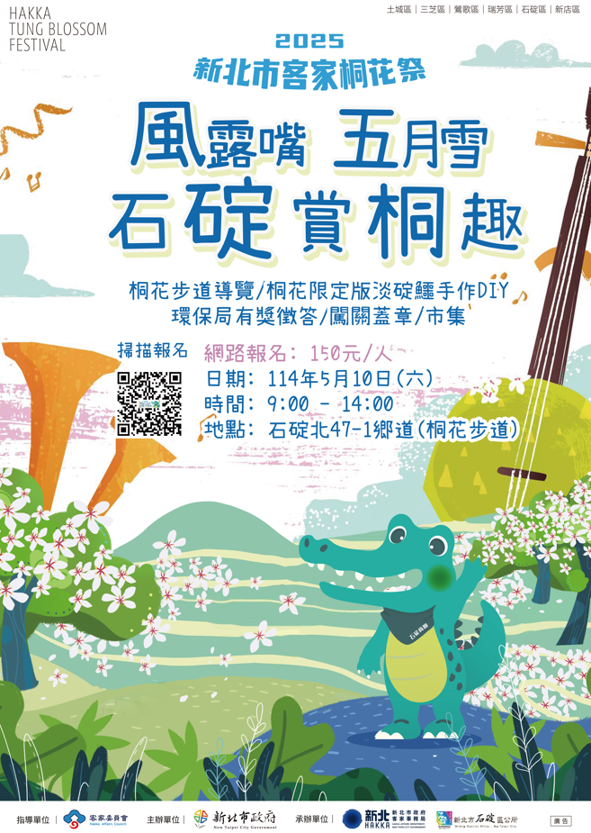 說明:旨皆活動謹訂於114年5月10日(星期六)上午9時至下午2 時 辦理,地點位於風露嘴(北宜路5段80號),沿線賞 桐、導覽、桐花限定版手作DIY,活動詳情請參閱 (https://ntpchakka-tungblossom.com/)。
