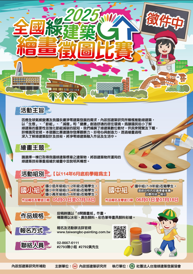 一、為加強綠建築扎根教育成效,本所自105年起辦理「全國綠 建築繪畫徵圖比賽」,並自110年度起納入教育部「十二年 國民基本教育免試入學超額比序」之全國性競賽項目。本 (114)年度「2025全國綠建築繪畫徵圖比賽」活動說明如 下: