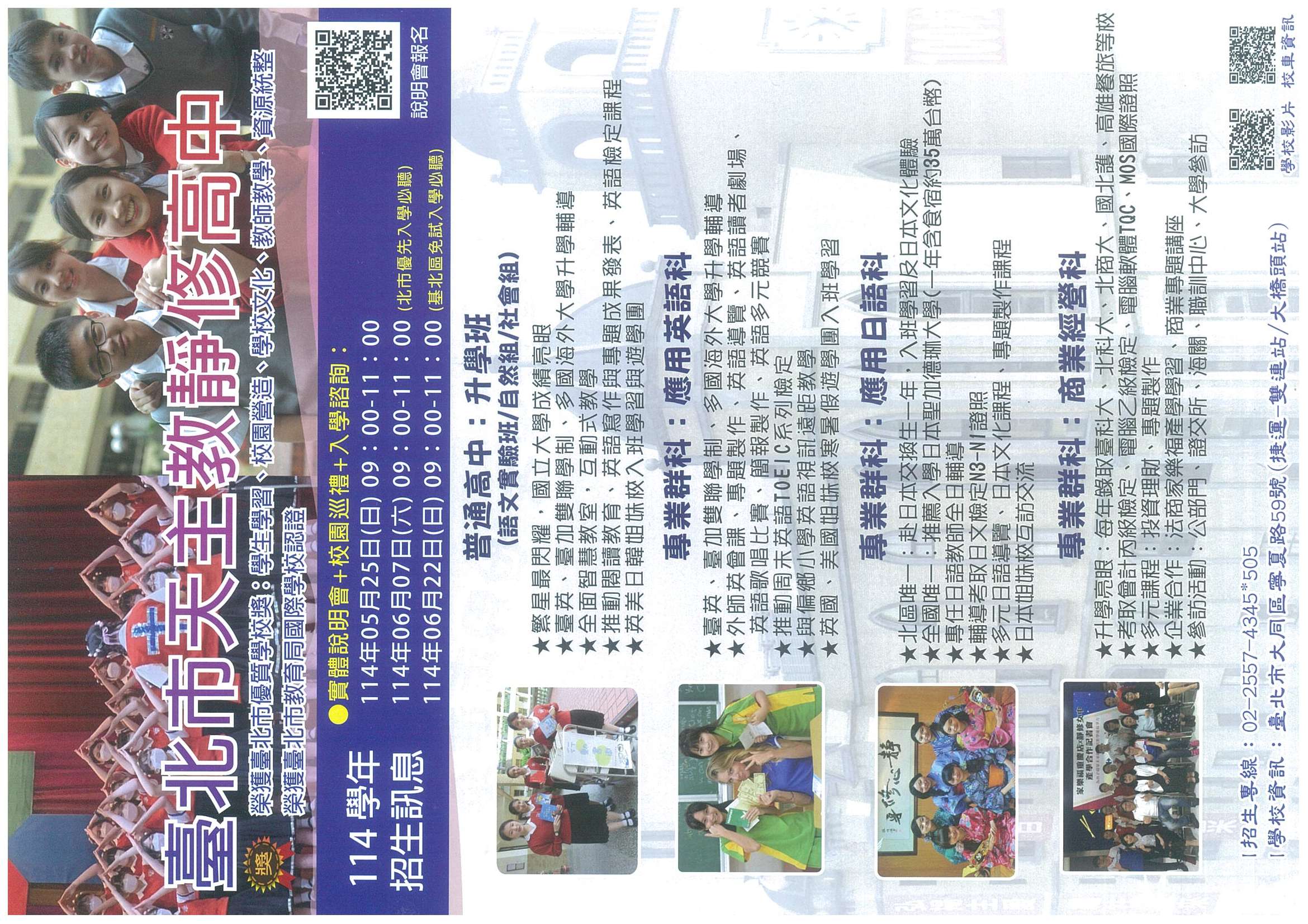 一、為使貴校家長與學生充分了解本校高中部普通科(英文實驗班)、應用英語科、應用日語科、商業經營科之入學資訊,舉辦招生說明會,如下列。敬請貴校輔導室協助公告相關資訊,並鼓勵對課程有興趣之親師生參加。