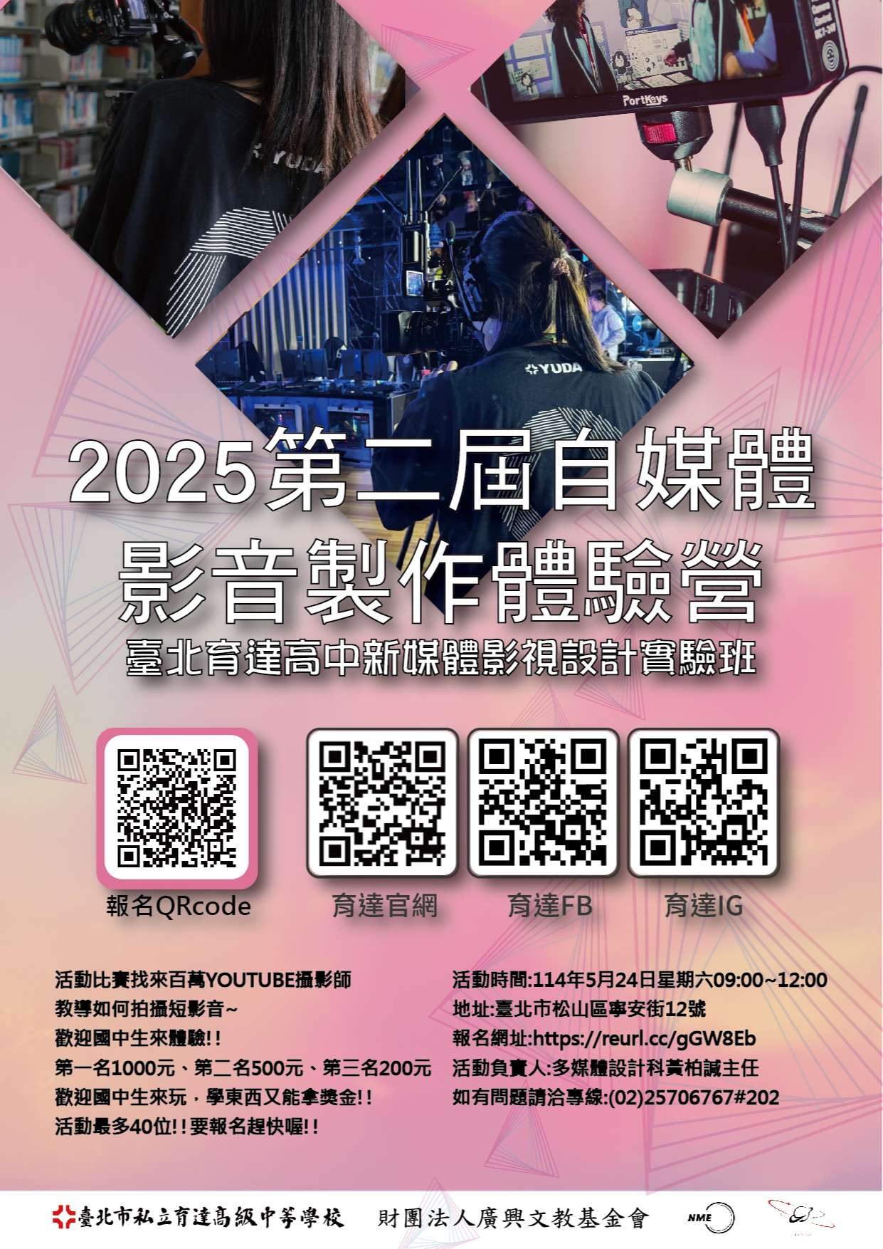 一、育達高中以掌握趨勢,培育達人作為宗旨,希望能夠讓更多學生及早學習職場技能,在業界成為佼佼者。「新媒體影視設計實驗班」為國內首創,本次活動找來百萬 YOUTUBER攝影師、東森攝影記者教導如何拍影片及製作短影音拍YOUTUBE、攝影直播等專業技能,歡迎國中生來體驗!!