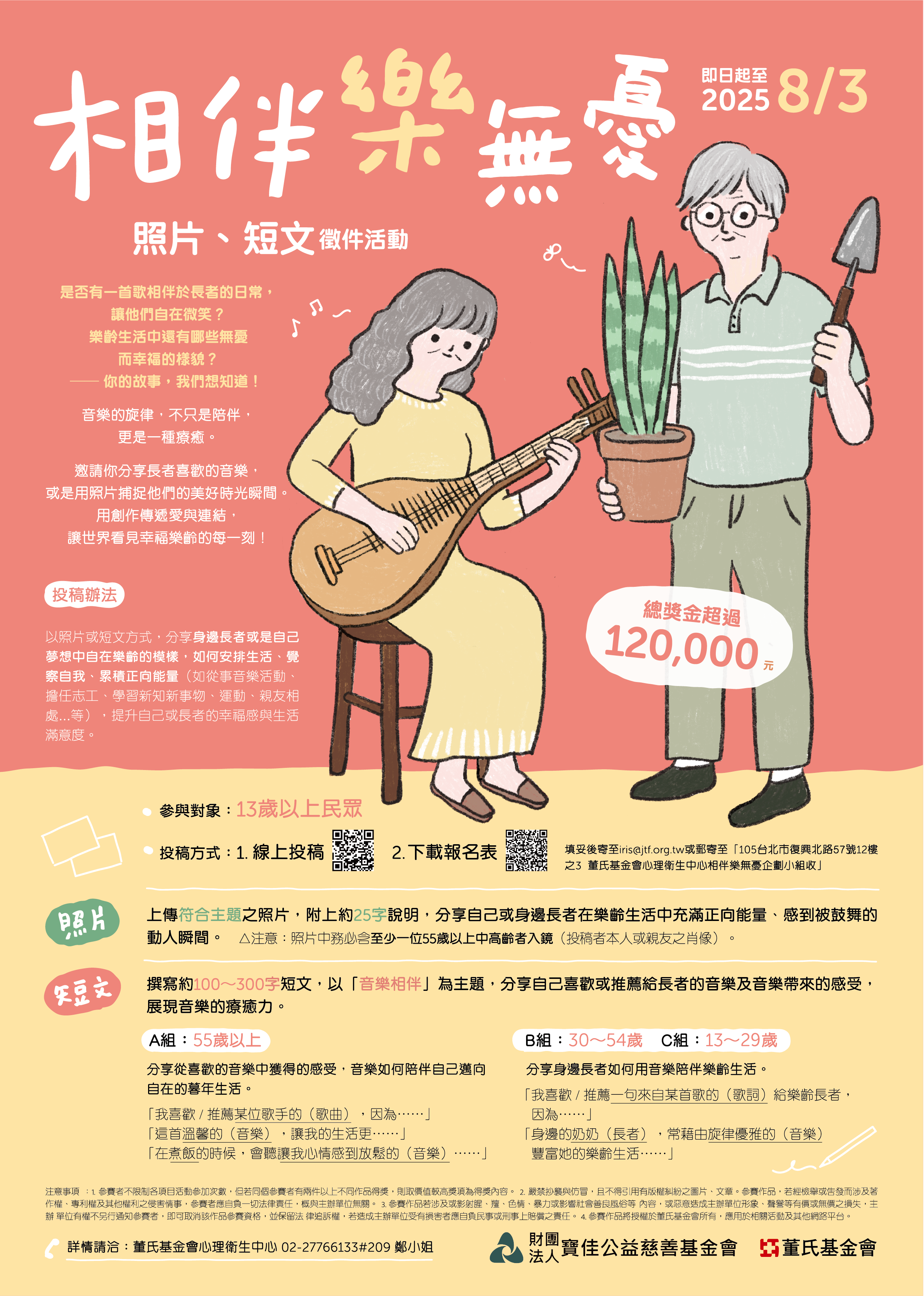 二、為鼓勵青少年透過活動參與,關心身邊長者心理健康並增加陪伴互動的機會,本會舉辦「相伴樂無憂-照片、短文徵 件活動」,即日起開始收件至民國114年8月3日截止。
