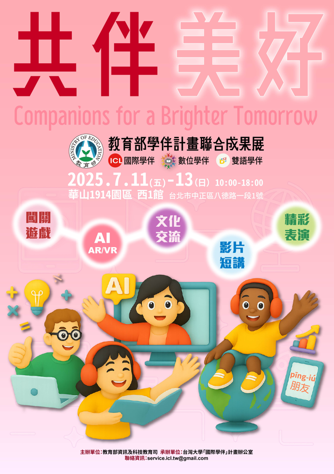 說明:教育部推動「數位學伴計畫」、「國際學伴計畫」及「雙 語學伴計畫」成果豐碩,邀請學伴計畫團隊、AI相關計畫 及民間企業共同響應,辦理旨揭成果展,歡迎親師生免費 參觀,活動資訊摘要如下: