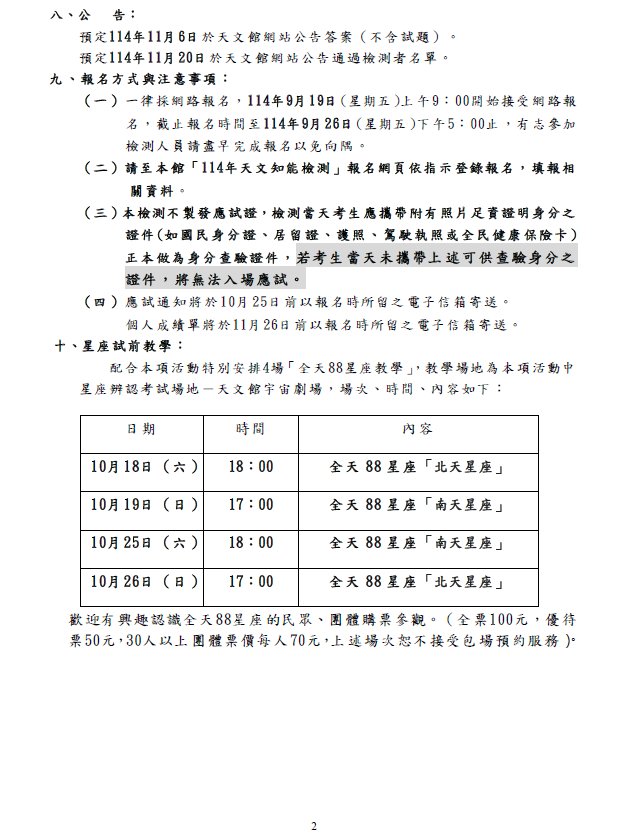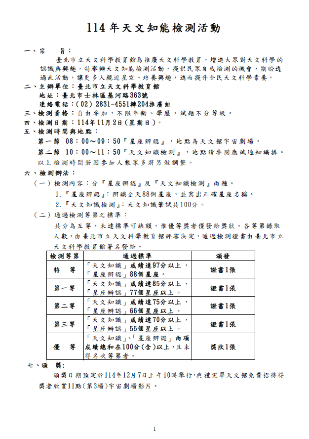 三、本檢測一律採網路報名,114年9月19日起至9月26日止,於 本館官網接受網路報名,報名注意事項請參考天文知能檢 測活動簡章。檢測日期為11月2日,11月20日公告通過檢測 名單,12月7日於本館舉行頒獎。