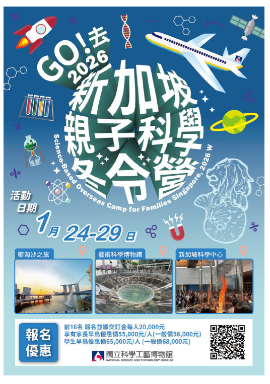 (一)新加坡團: 活動日期為2026年1月24日至29日,主要科學 活動地點有藝術科學館(Art Science Museum)與新加坡 科學中心(Science Centre Singapore),另特別安排具 有科學創思之濱海灣雨旋渦(Rain Oculus,Marina Bay)、星耀樟宜(ChangI Jewel)、鳥園(Bird Paradise) 等景點,並設計相對應之科普動手做活動,活動海報與 簡介如附件1。