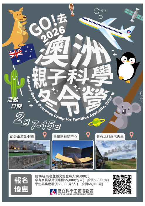 (二)澳洲團: 活動日期為2026年2月7日至15日,主要活動地點有墨爾本博物館(Melbourne Museum)、墨爾本科學中 心(Science Work, Melbourne)、昆士蘭博物館 (Queensland Museum)及昆士蘭海事博物館(Queensland Maritime Museums),另特別安排具有科學創思之蒸汽火 車(Steam Train, Puffing Billy)、疏芬山淘金小鎮 (Sovereign Hill)、菲律普企鵝島( Little Penguin, Philip Island)及黃金海岸(Gold Coast, Brisbane)等 特殊景點,並設計相對應之科普動手做活動。