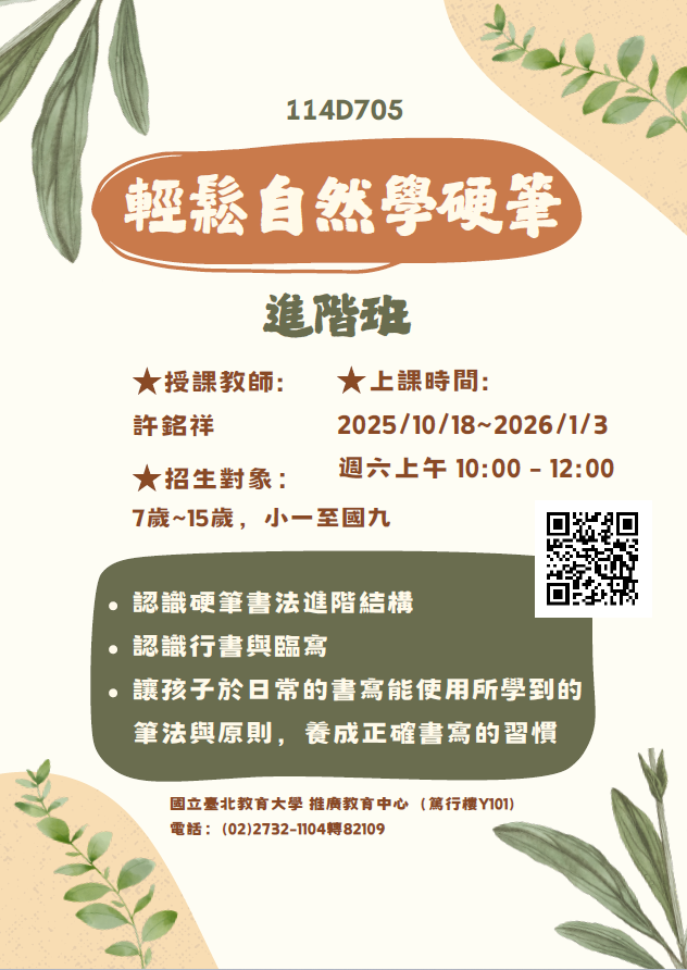 二、「114D705 輕鬆自然學硬筆進階班」課程時間為114年10月 18日至115年1月3日,每周六上午10:00 - 12:00,合計2小 時,12次。課程費用為每人6800元,材料費250元,初次報 名需繳交報名費300元,網頁https://cce.ntue.edu.tw /course/5869 。